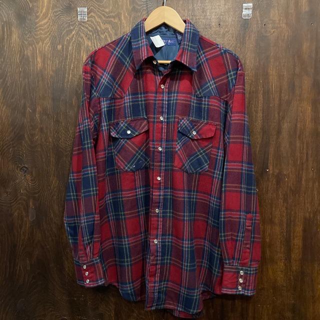 SPARE TIME アクリル 長袖 チェックシャツ Lサイズ アメリカ古着 ヨーク切り替えです。 アメリカのアパレルブランド、SPARE TIMEのアクリル素材長袖チェックシャツ。 アクリルウール100%のチクチクさを感じない着やすい質感。 レッド×ネイビー系のチェックが渋めで合わせやすい良い雰囲気。 ヨーク切り替え、トップボタン以外スナップボタン等、ウェスタンシャツのディテールが盛り込まれてます。 サイズ表記はL表記です。 実寸は肩幅50cm 身幅(脇下測定)62cm 着丈(襟付け根から) 79cm 袖丈60cmです。 右ポケット付近にペンキ汚れ有り。 両脇下のステッチほつれ有り。 保管時についたシワや毛玉など使用感は御座いますが着用に支障をきたすようなダメージは御座いません。 当商品は古着となります。 サイズや状態などご不明点等あれば、お気軽にお問い合わせください。 #アメリカ古着 #us古着 #チェックシャツ #ウールシャツ #ネルシャツ #長袖シャツ #ビンテージ古着 #アクリルシャツ