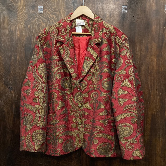 Beverly's ボタニカル柄 テーラードジャケット ゴブラン織り 赤 総柄です。 レディースファッションブランド、Beverly'sの総柄テーラードジャケット。 赤ベースのボタニカル柄がに立体的なボタンなどが特徴的な個性的な一品。 ゴブラン織りのように立体感のある質感で、赤地の部分はベロアのような肌触り。 サイズ表記はレディース3L表記です。 実寸は肩幅51cm身幅(脇下測定)76cm 着丈(襟付け根から)65cm 袖丈62cmです。 ボタン合わせはレディース仕様ですが、メンズのXL相当のサイズ感となります。 保管時についたシワや細かな擦れなど使用感は御座いますが着用に支障をきたすようなダメージは御座いません。 当商品は古着となります。 サイズや状態などご不明点等あれば、お気軽にお問い合わせください。 #アメリカ古着 #us古着 #スーツジャケット #テーラードジャケット #総柄テーラードジャケット #総柄ジャケット #ボタニカル柄 #ジャケット #ゴブラン織り