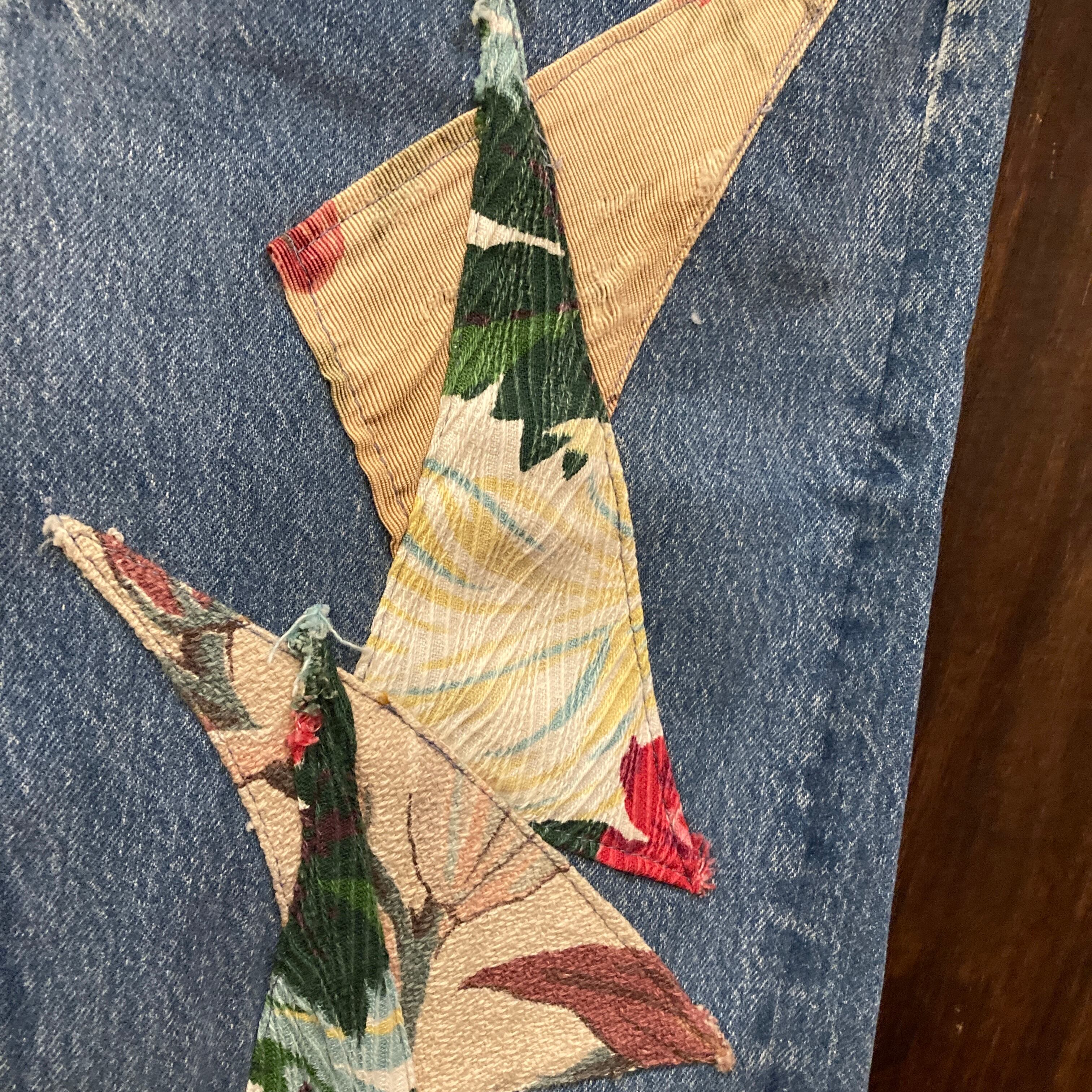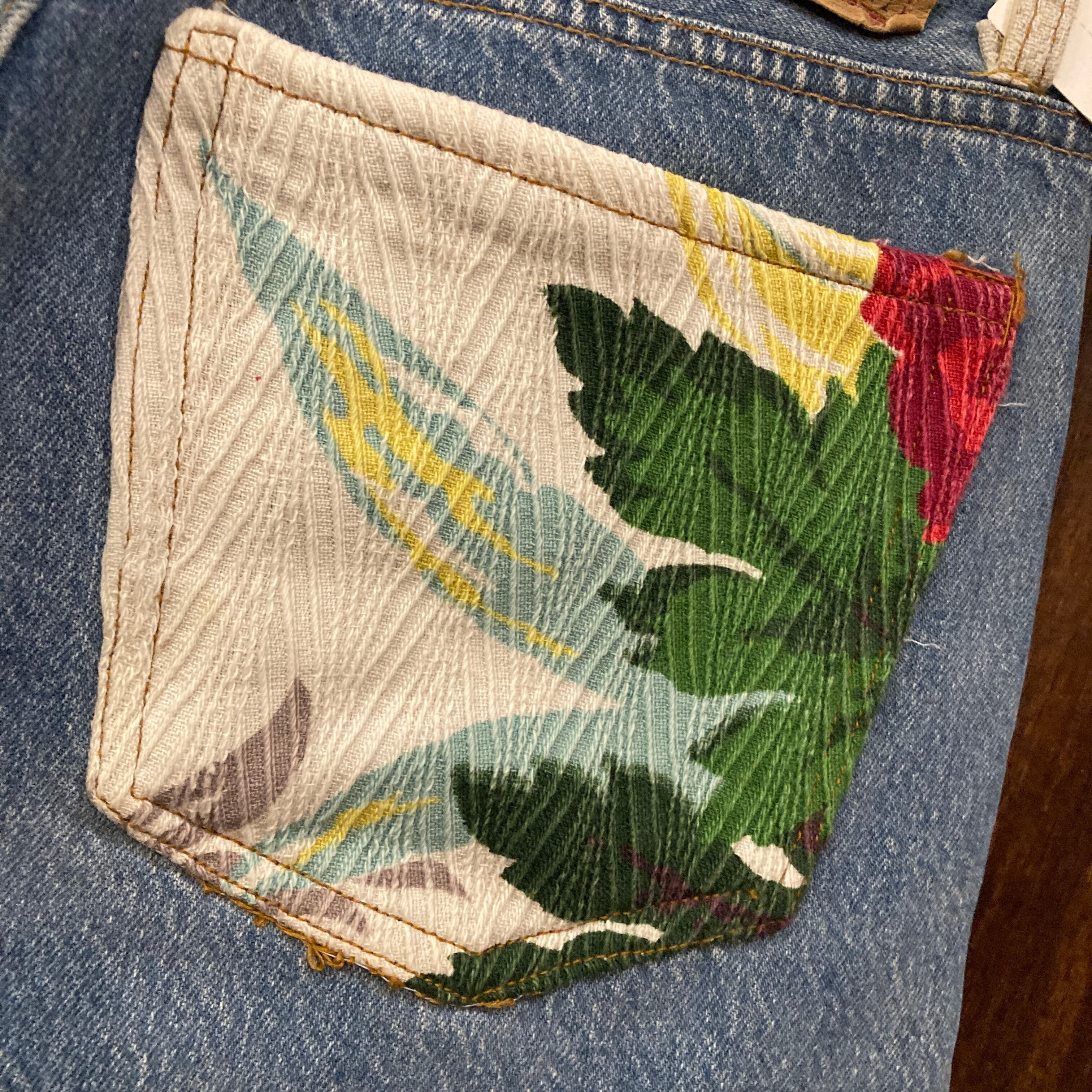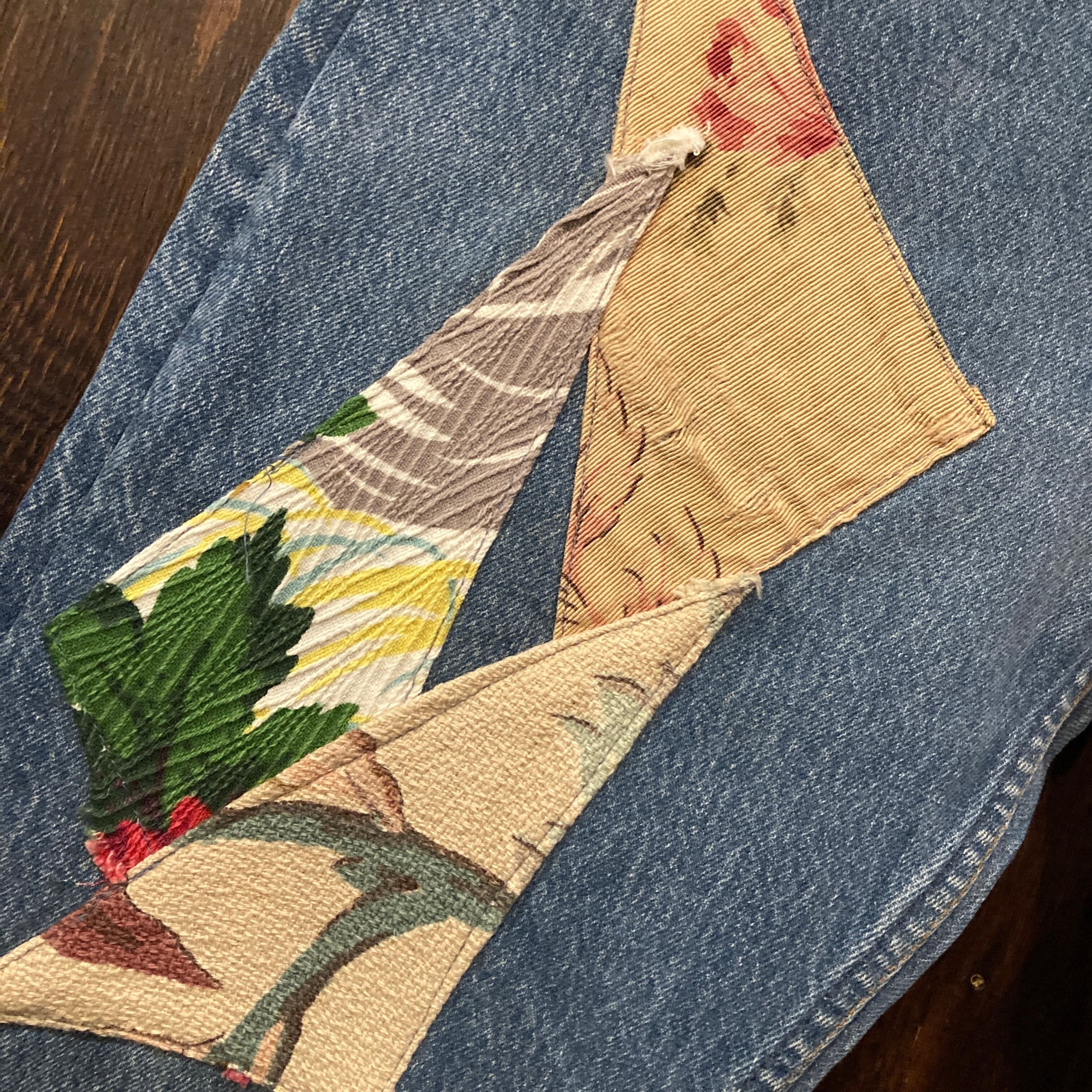 ベルトループやバックポケット、太もも部にボタニカルモチーフのオールドファブリックが縫われた他と被らない唯一無二の個性的な一品。