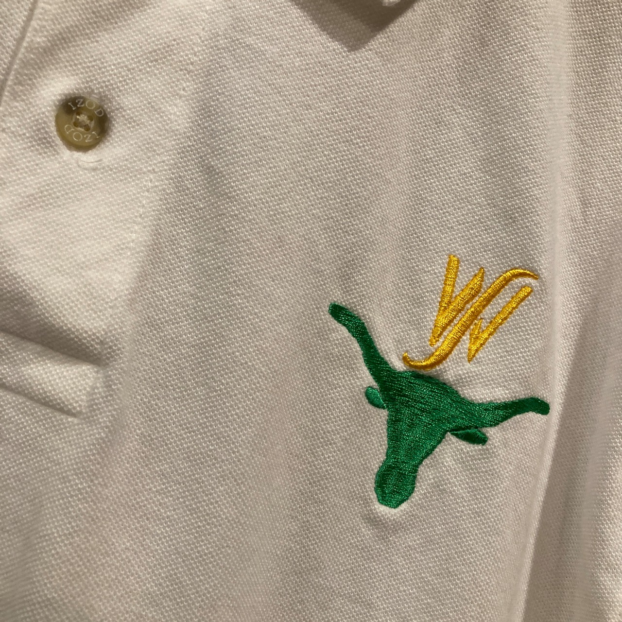 白ボディの左胸にテキサスロングホーンが刺繍された、恐らく大学などのスポーツチームの一品。