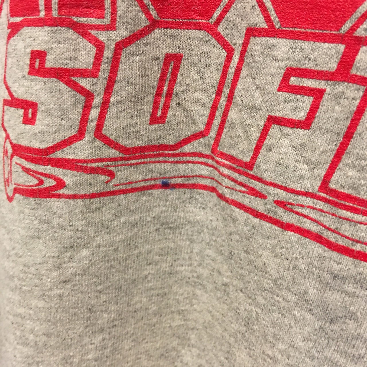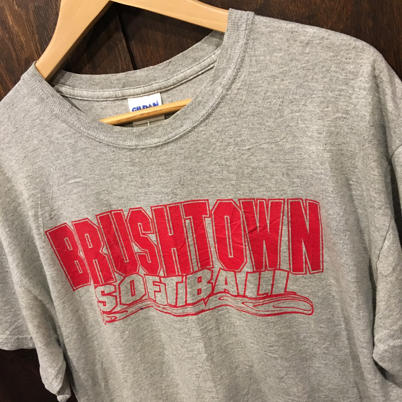 コットン90%、ポリエステル10%のグレーボディに三段プリントでソフトボール部のフォントがデザインされたカレッジTシャツ。