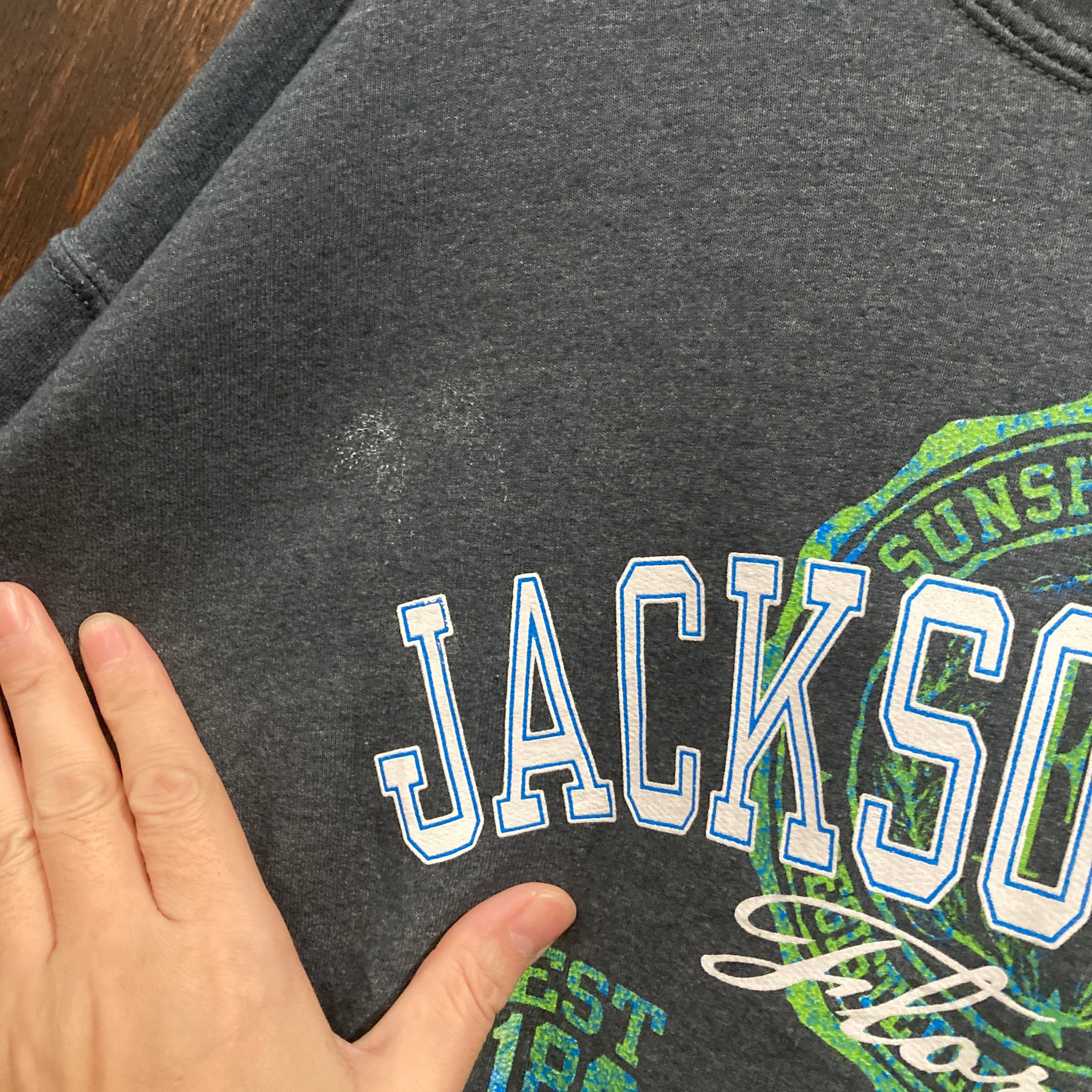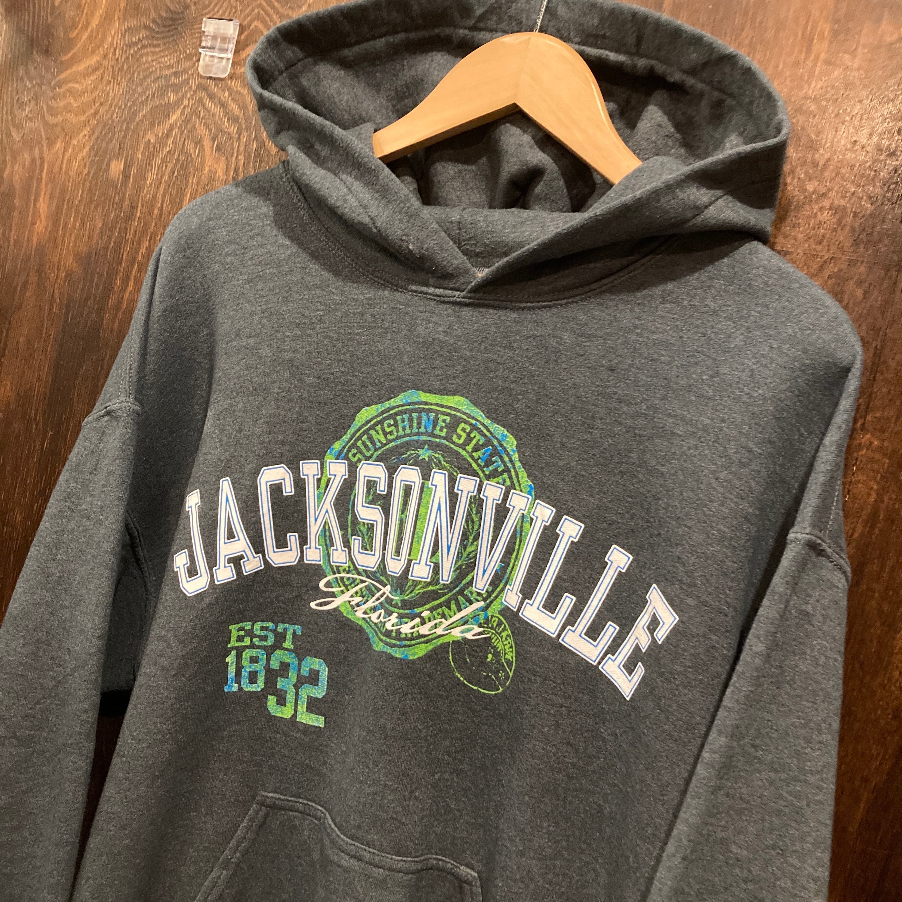 グレーボディにフロリダ州の北東部に位置する都市、Jacksonvilleのプリントが中央に施された渋めのスーベニアスウェットパーカー。
