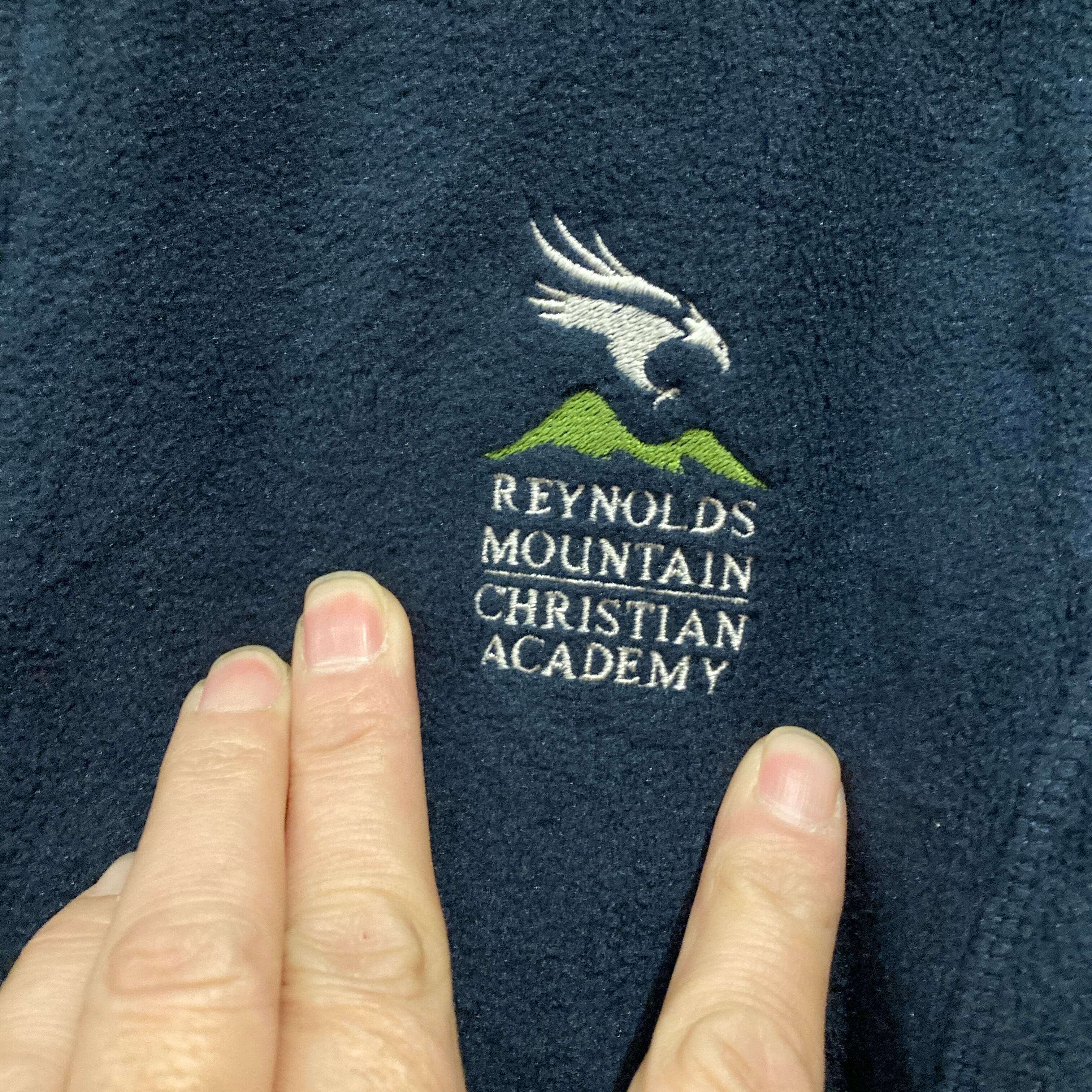 紺ベースの左胸にキリスト教系学校のロゴが刺繍されてます。