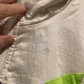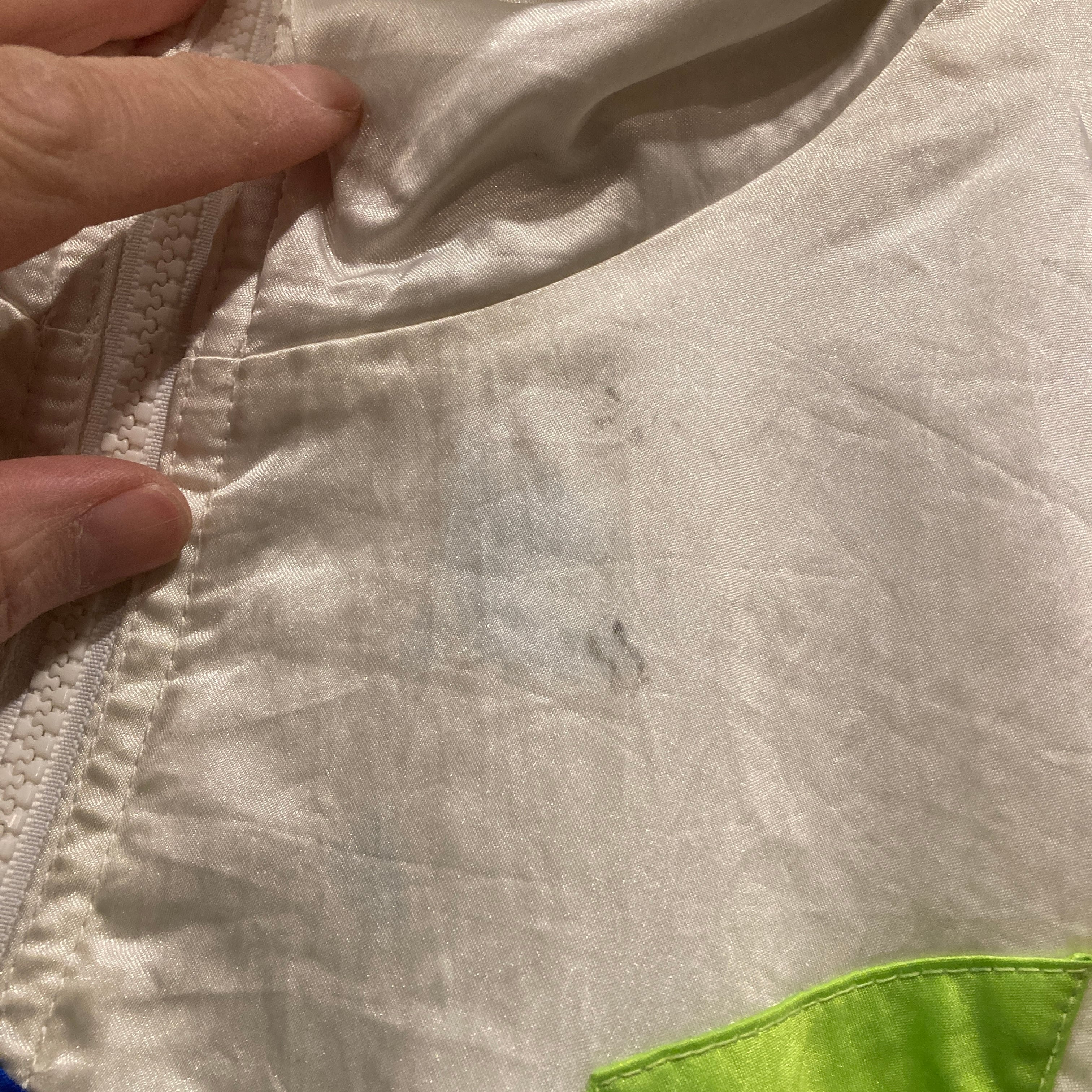 フロント左胸部、フラップ部、右袖などに色移りや汚れ有り。