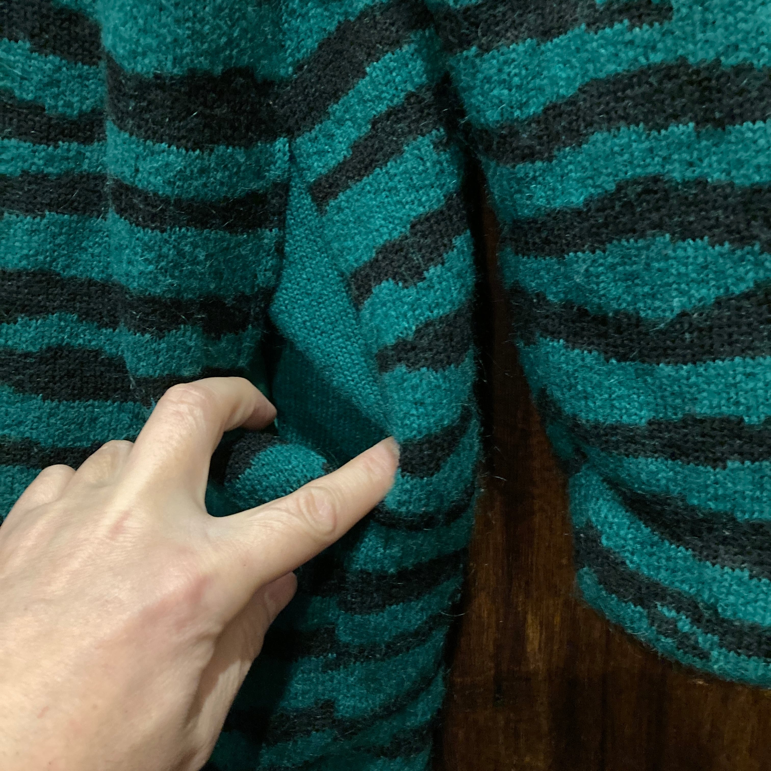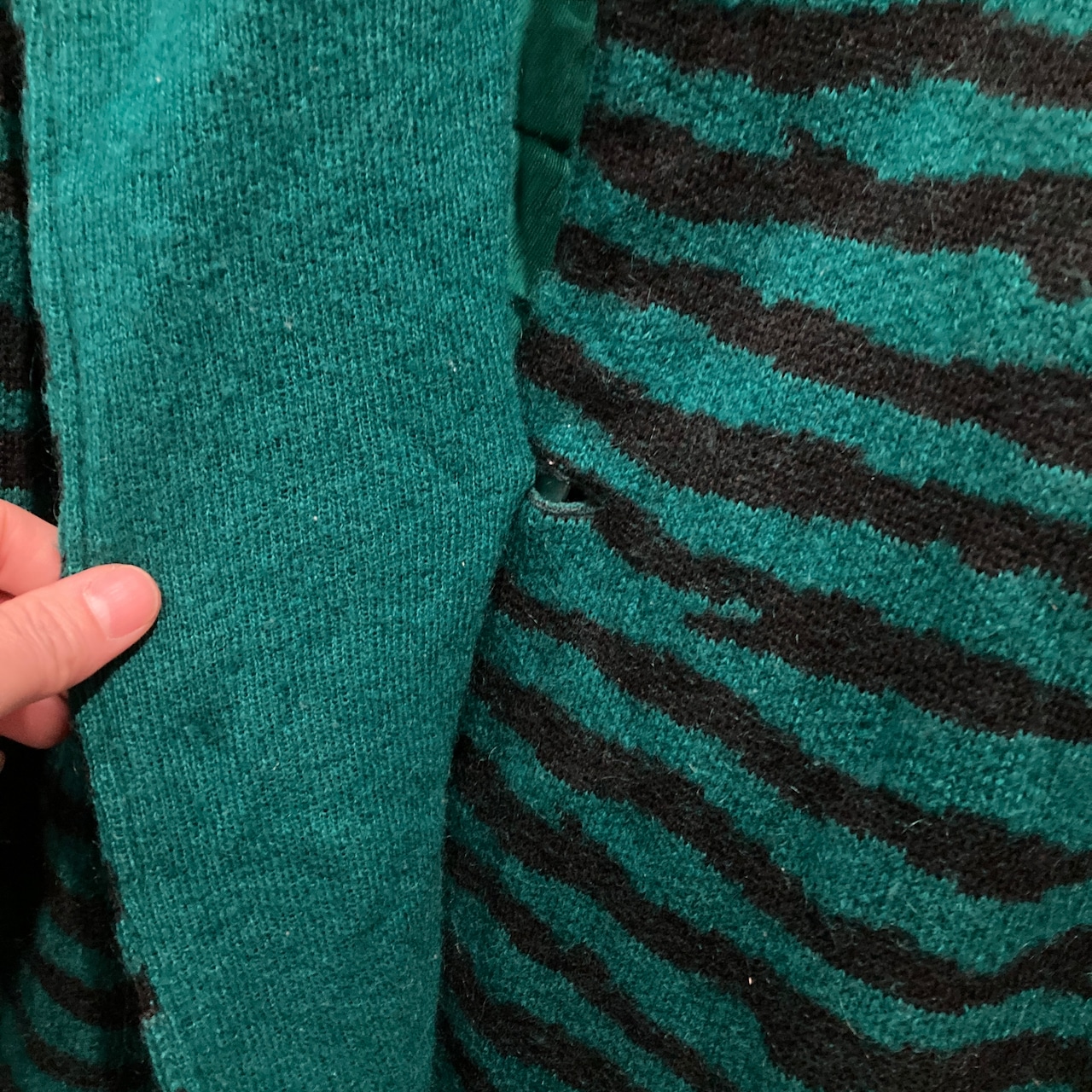 やや毛足の長いウール素材のグリーンとブラックのゼブラ柄が存在感抜群な一品。