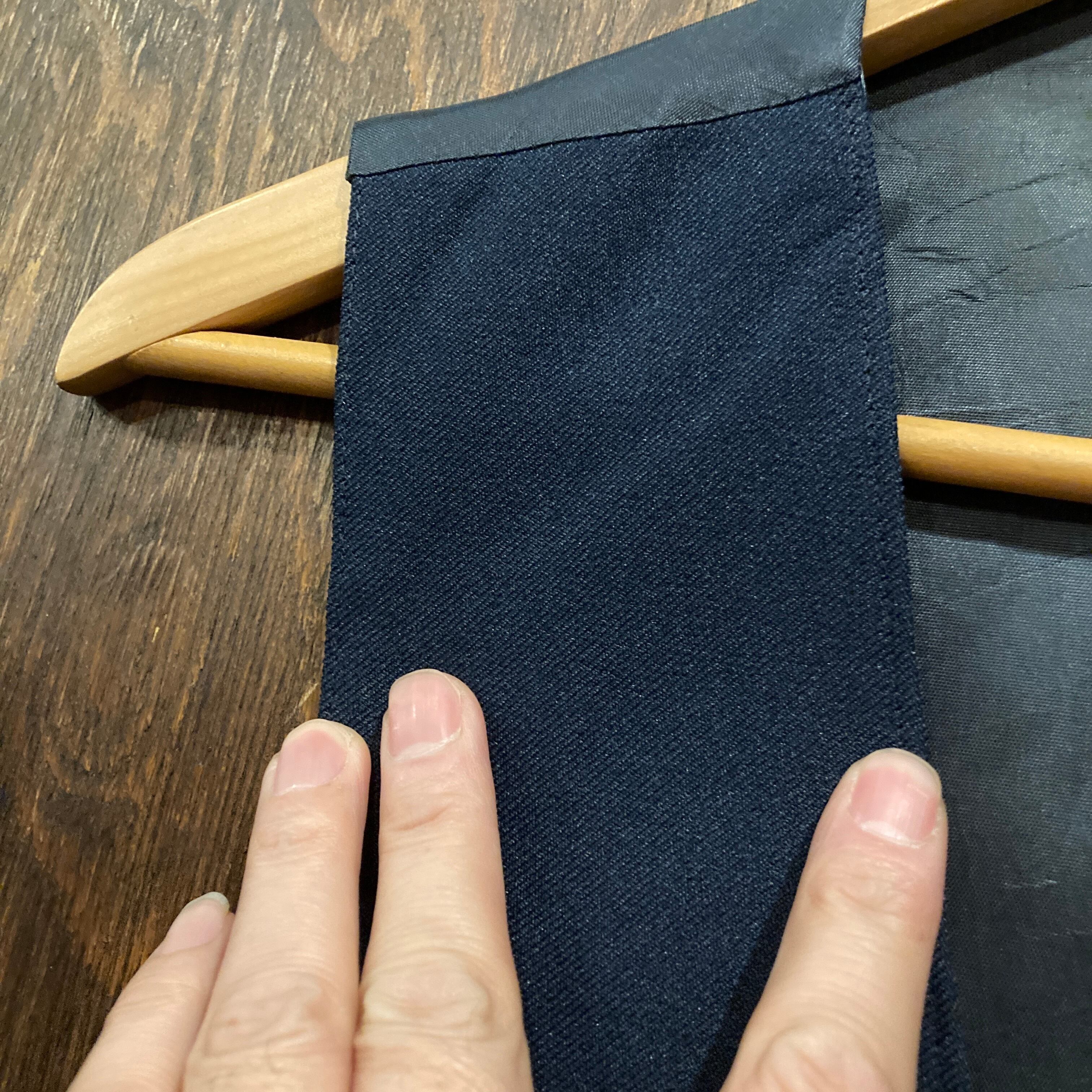 フロントは濃いめのネイビーの単色、バックはブラックのサテン系素材で渋めな一枚。