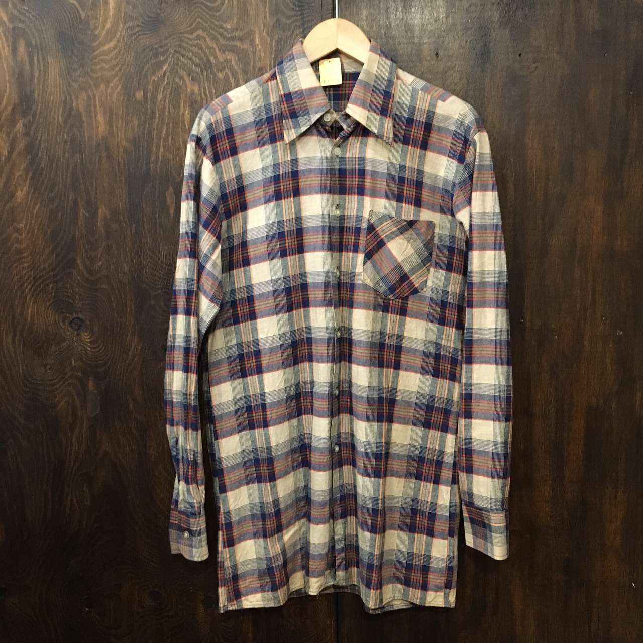ユーロ古着 長袖 チェックシャツ リネンシャツ ロング丈 70年代 ビンテージです。