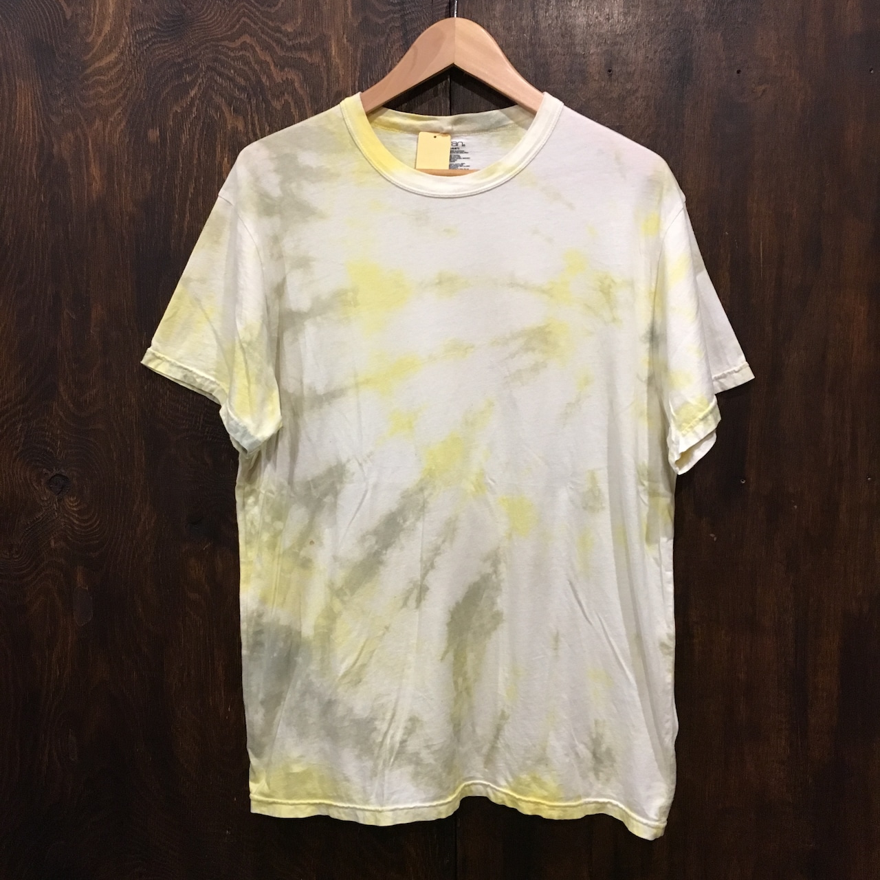 白地を緑と黄色で淡くタイダイ染めした個性的な一枚。