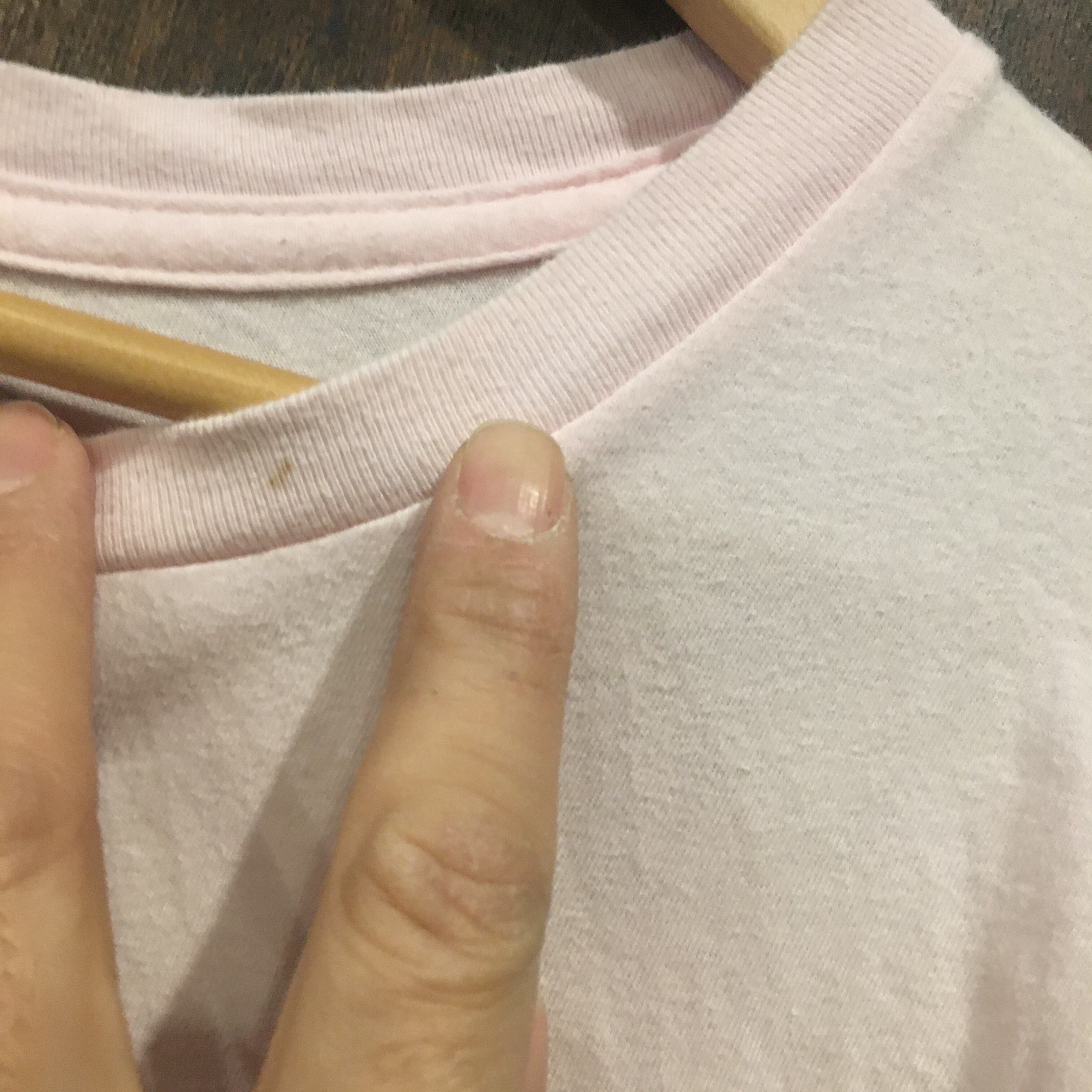 薄いピンクボディにポケット部とバックにプリント入り。一枚で存在感のあるデザインです。