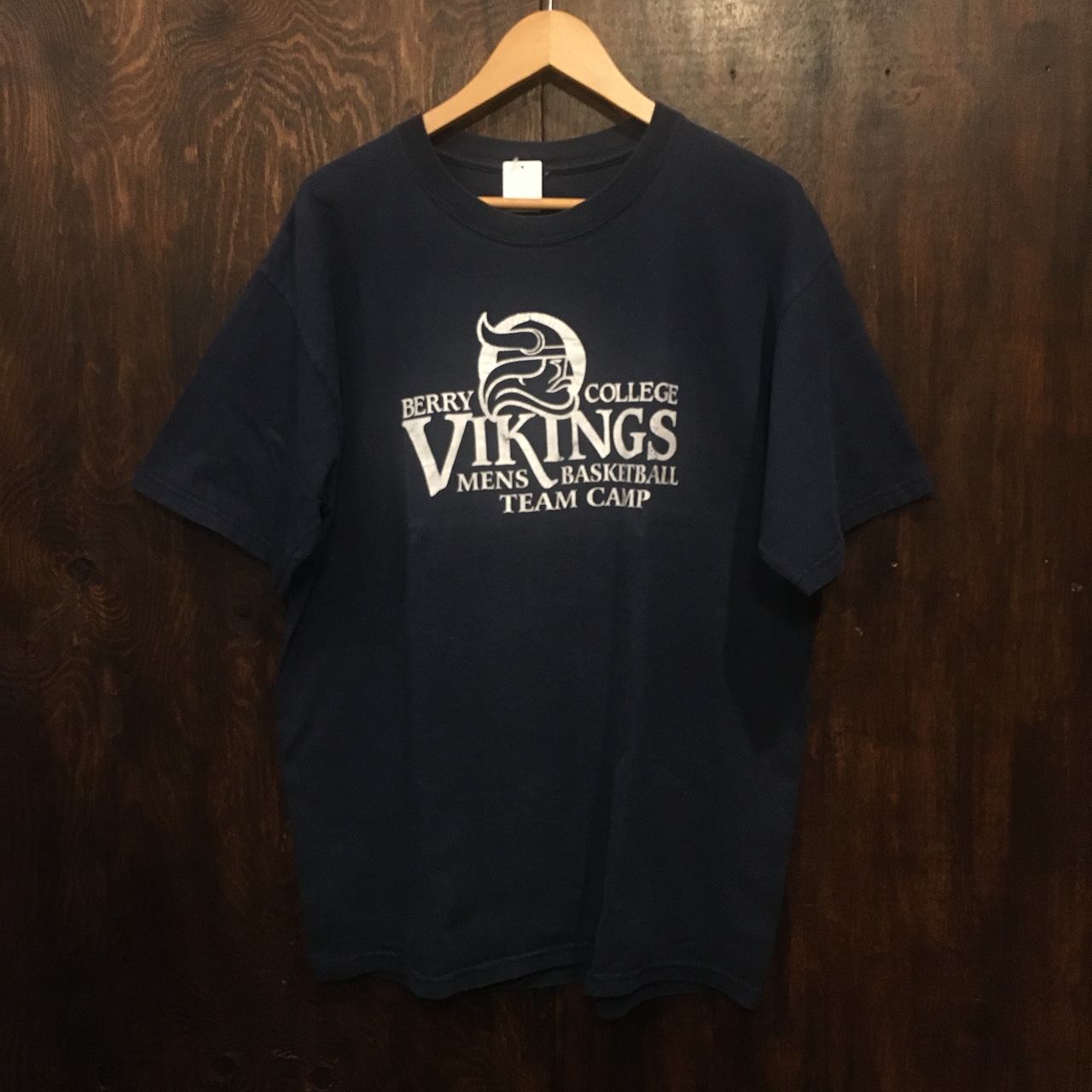 ネイビーボディに白でバイキングがプリントされたカレッジTらしいでデザインです。