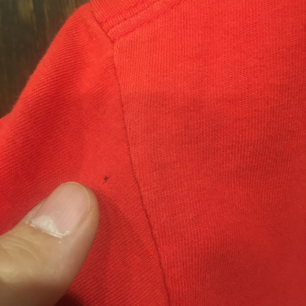コットン100%の赤ボディに両面プリントの半袖Tシャツ。