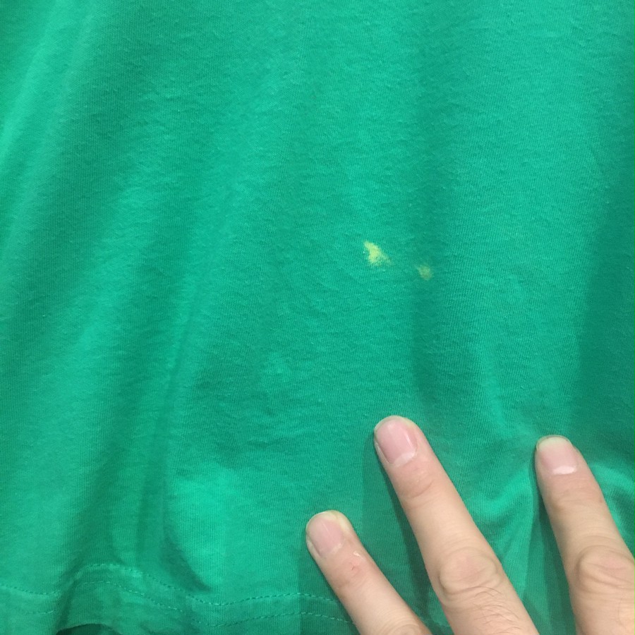 コットン100%のあせた緑ボディに両面プリントの半袖Tシャツ。