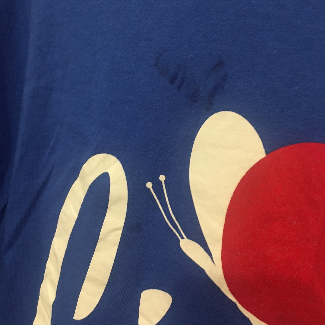 ブルーボディのフロントにハートマークであしらった蝶とメッセージプリント。
