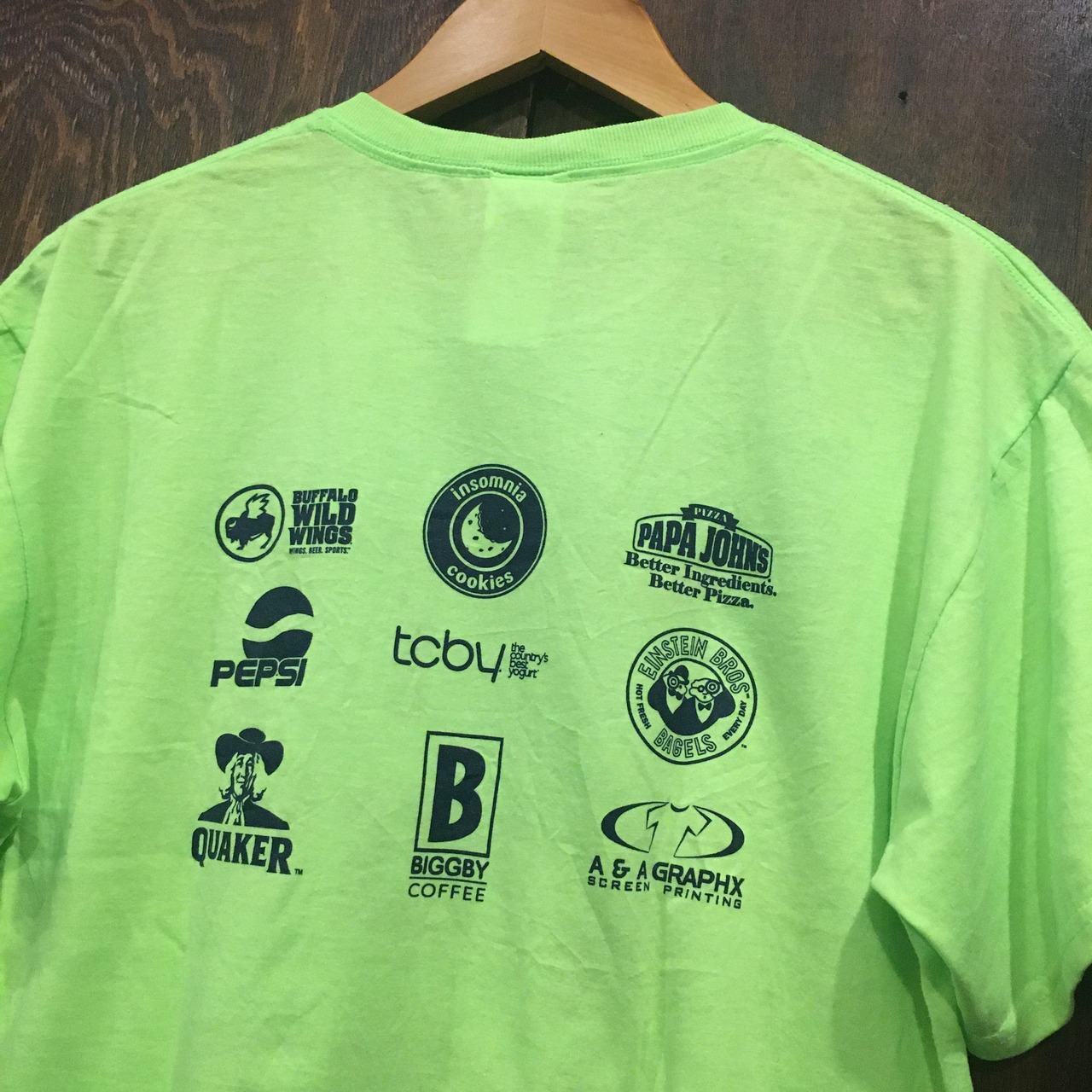 アメリカ古着 半袖Tシャツ イベントプリン蛍光グリーン Mサイズ 企業プリントです。