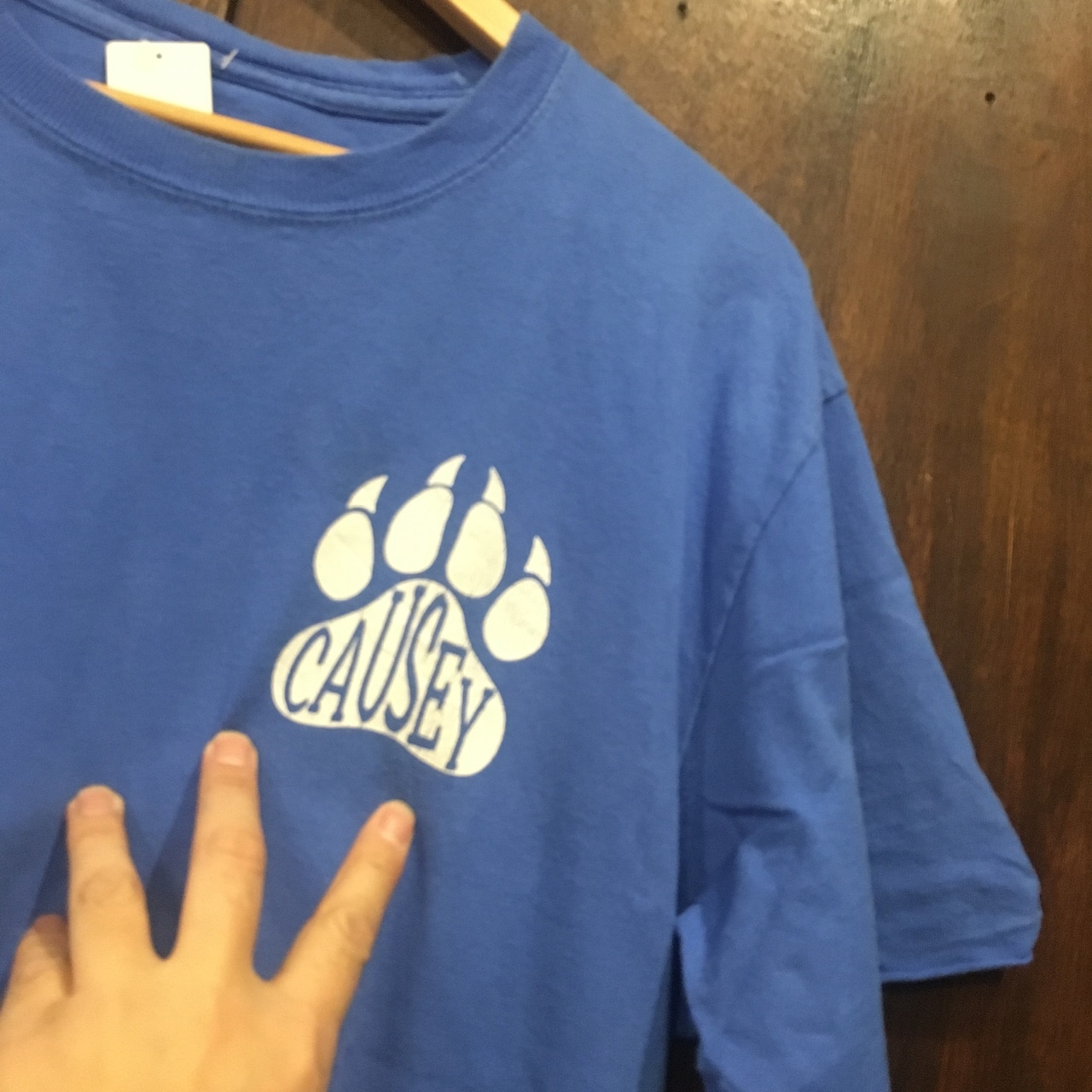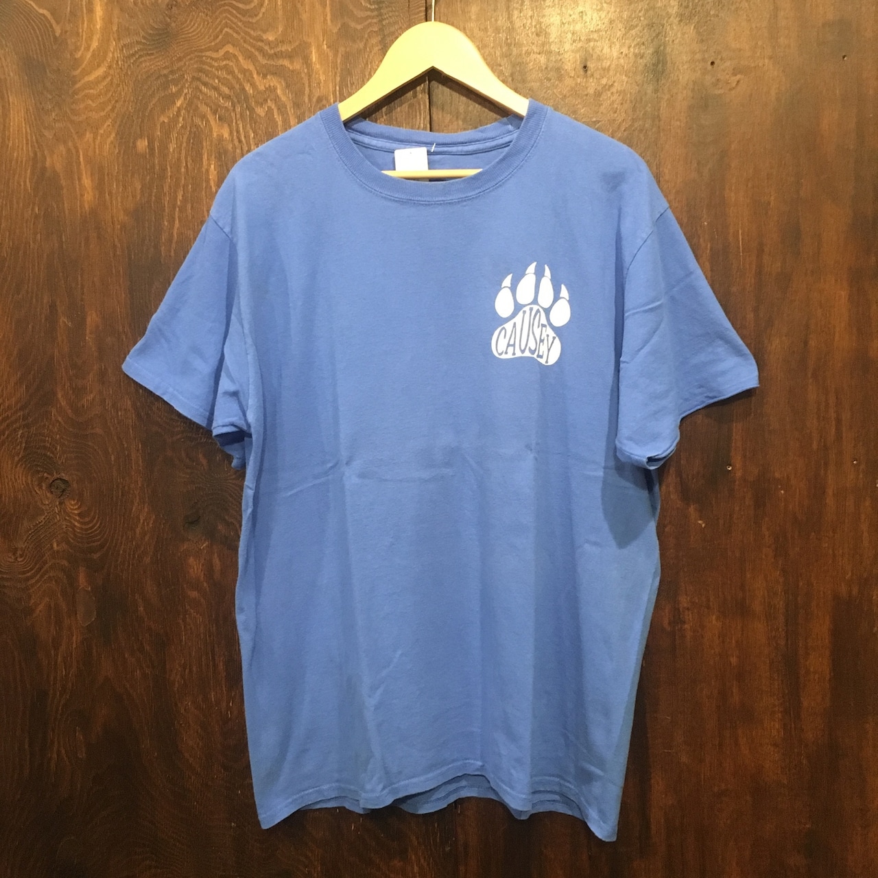 ブルーボディのフロント左胸に動物の足跡とCAUSEYとプリント。