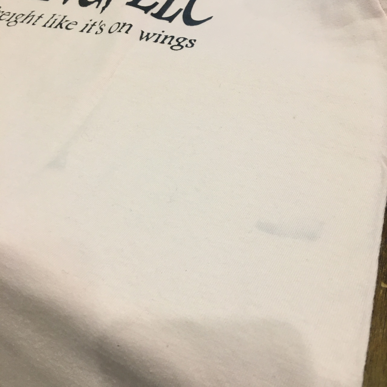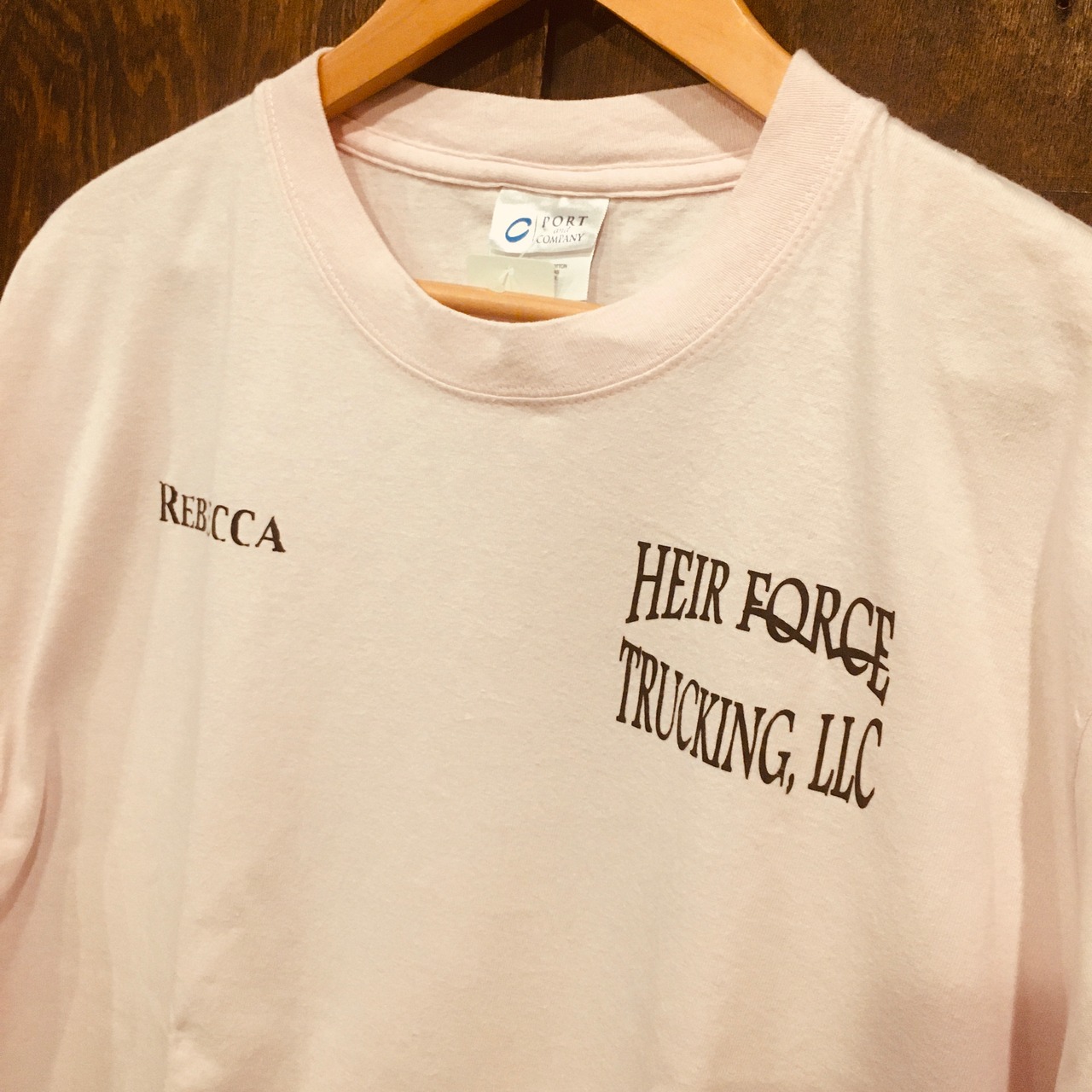 淡いピンクボディにアメリカの運送会社のロゴなどがフロント両胸とバックにプリントされた豪華なデザイン。