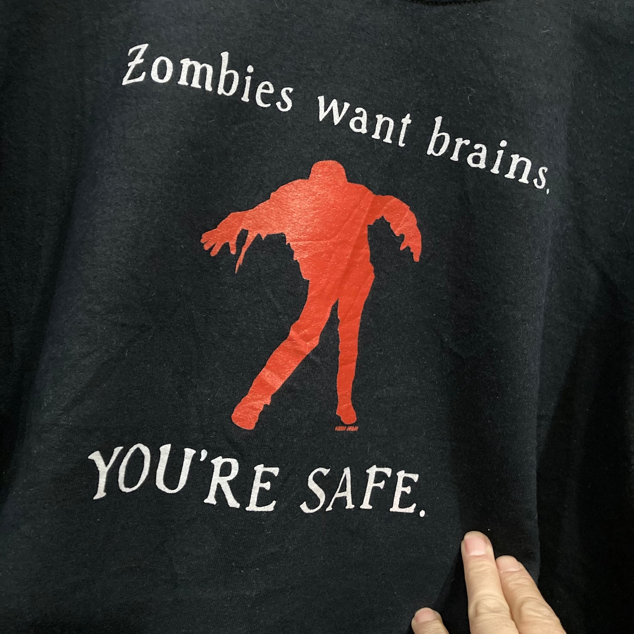 コットン50% ポリエステル50%の黒ボディにエッジの効いたユニークなメッセージとゾンビがプリントされてます。