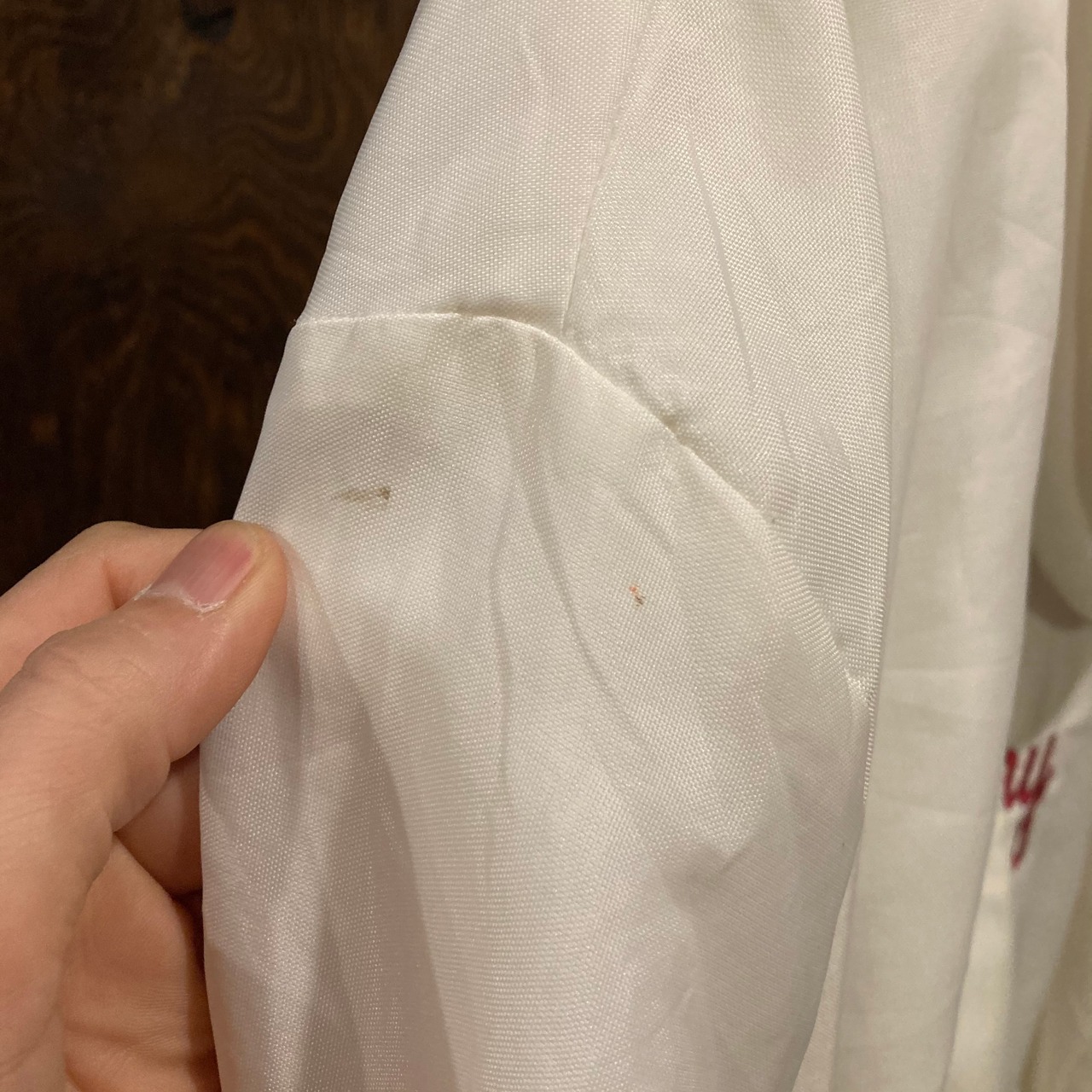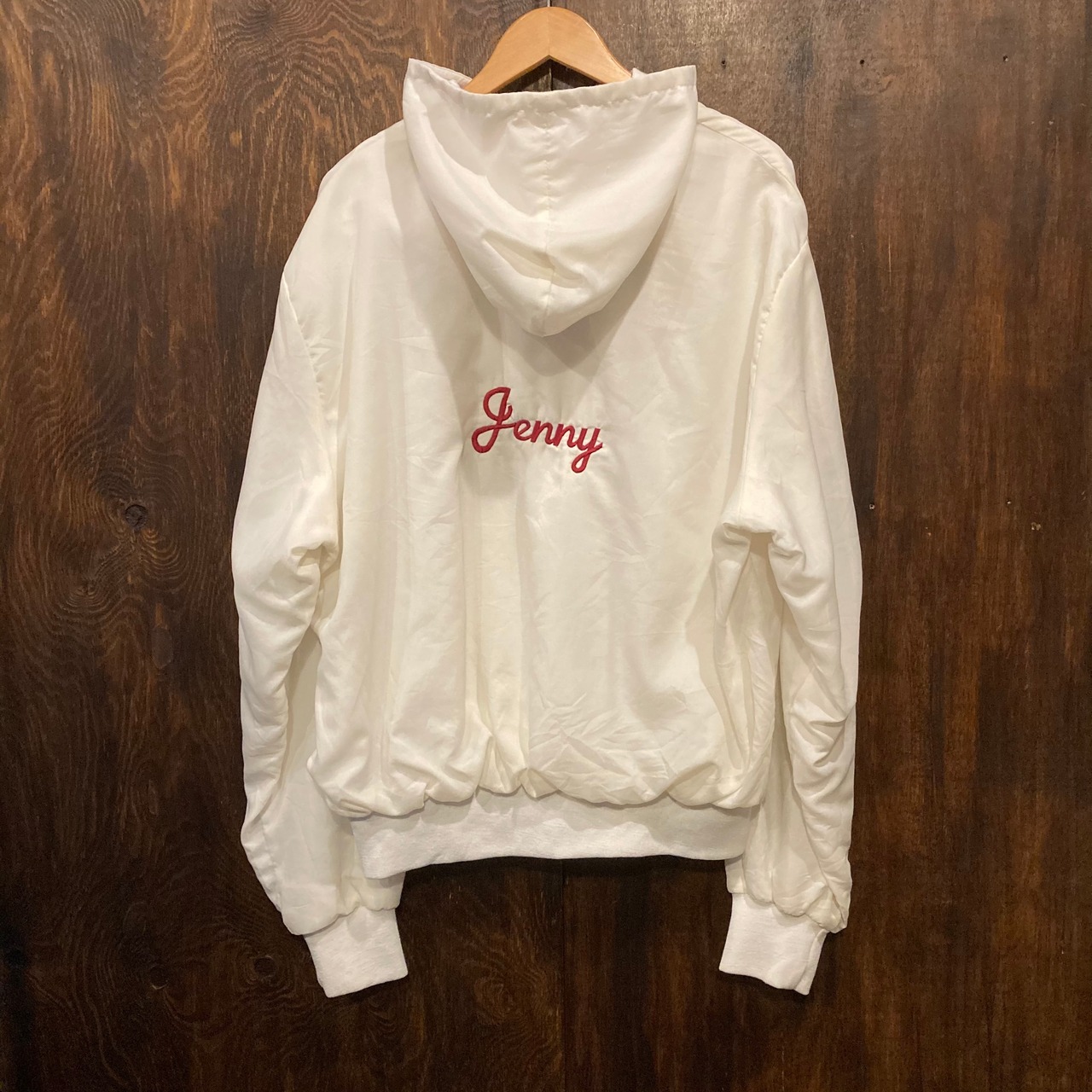 シャリ感のあるナイロン素材にフロント左胸とバックに刺繍入り。