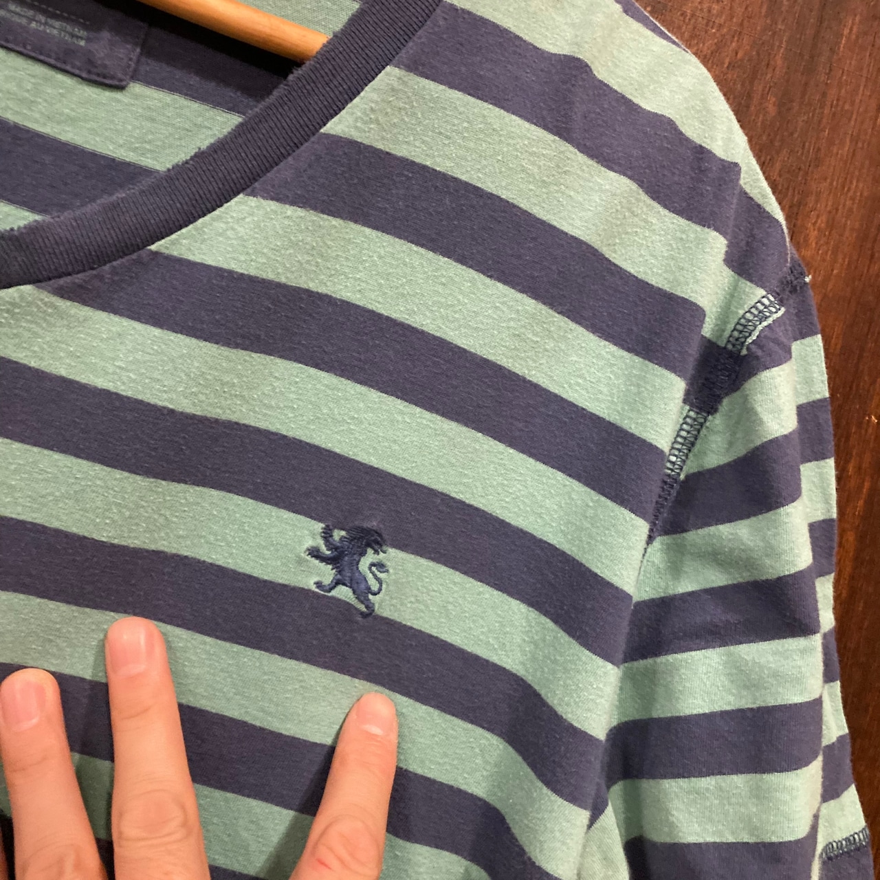 くすんだネイビーとグリーンのボーダー柄が爽やかな一品。