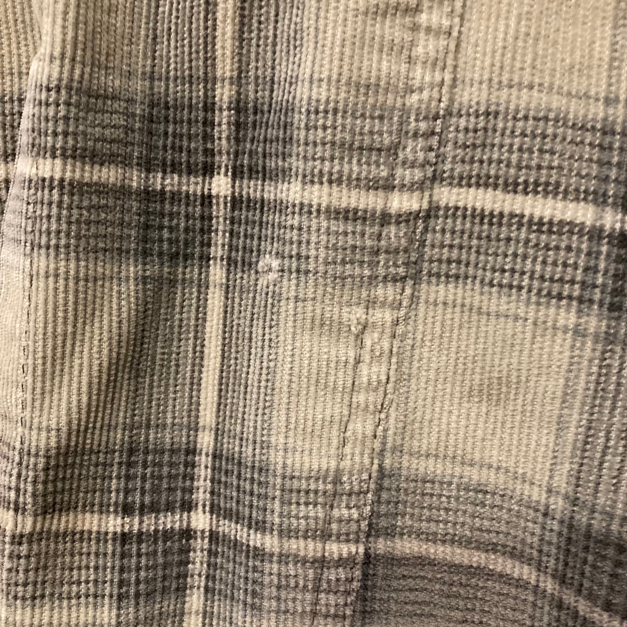コーデュロイ素材に淡いベージュ系のチェック柄があしらわれた個性的な一品。