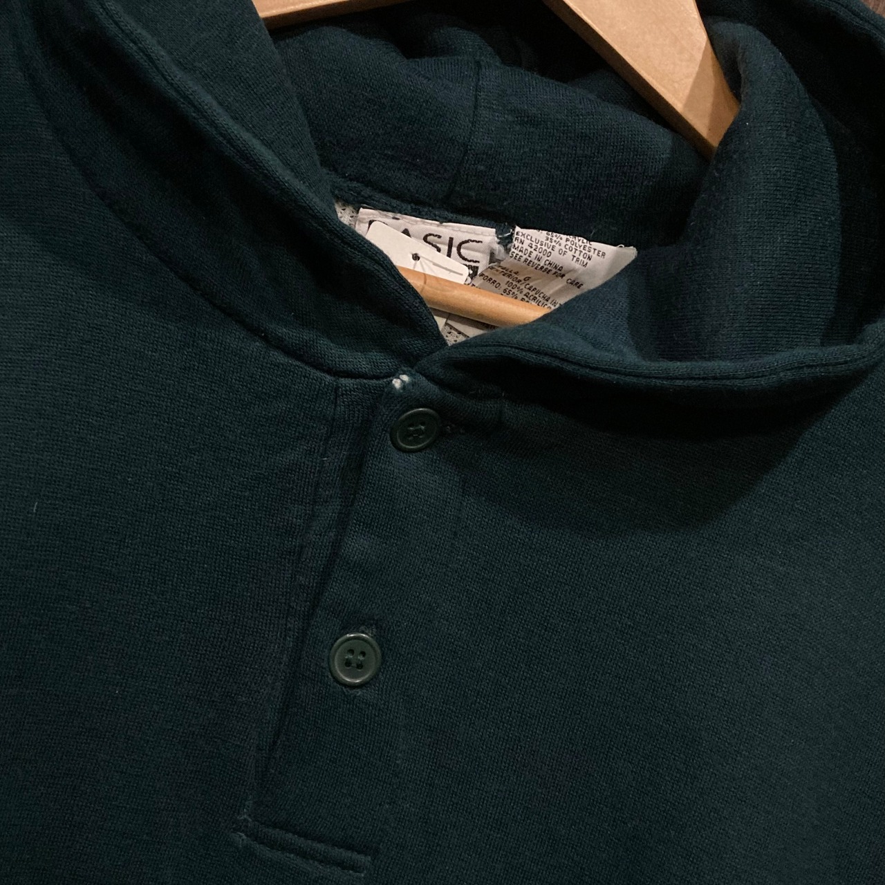 単色の濃いグリーンボディのハーフボタンスウェットパーカー。