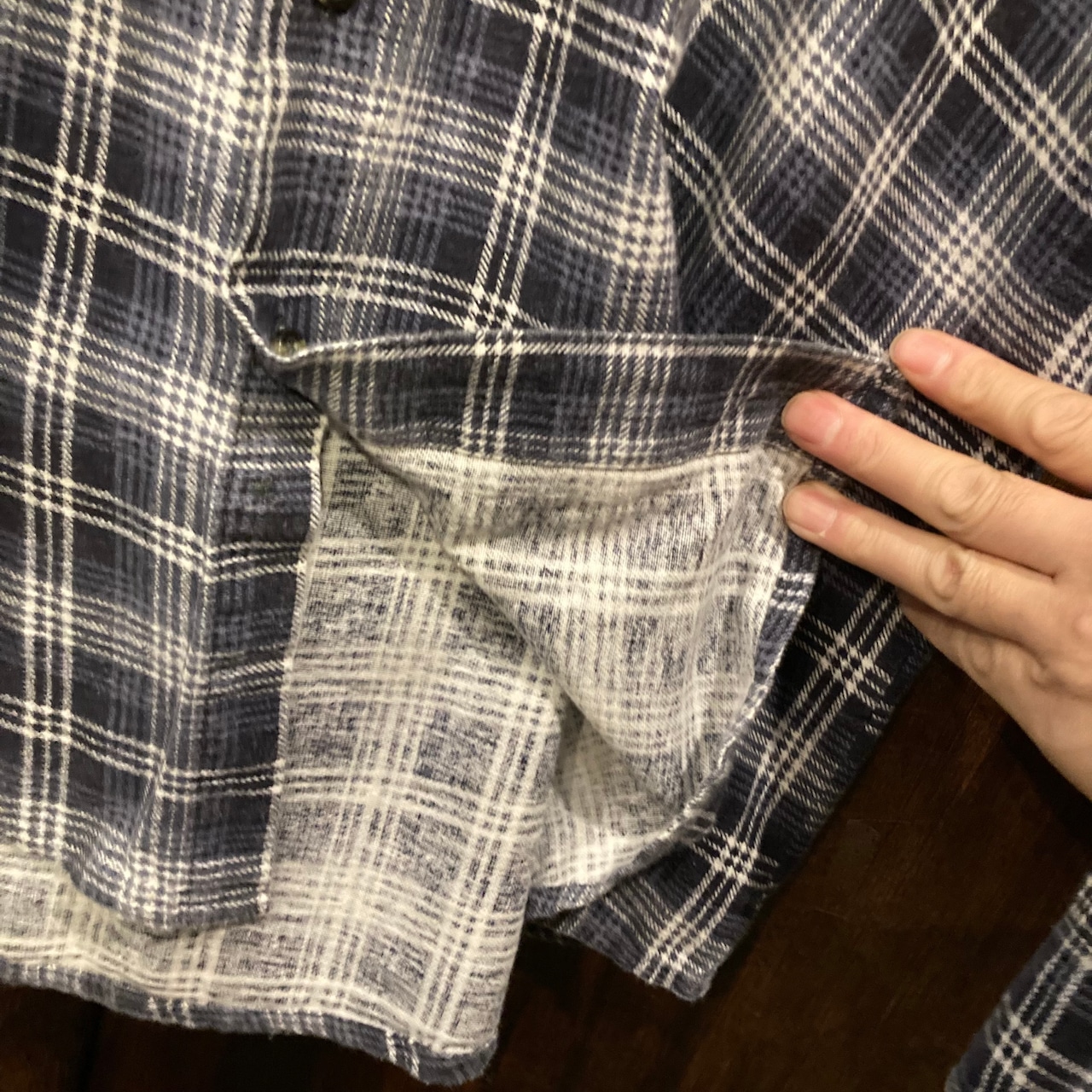 プリントネルシャツ特有のやや毛羽だったような質感が良い雰囲気です。