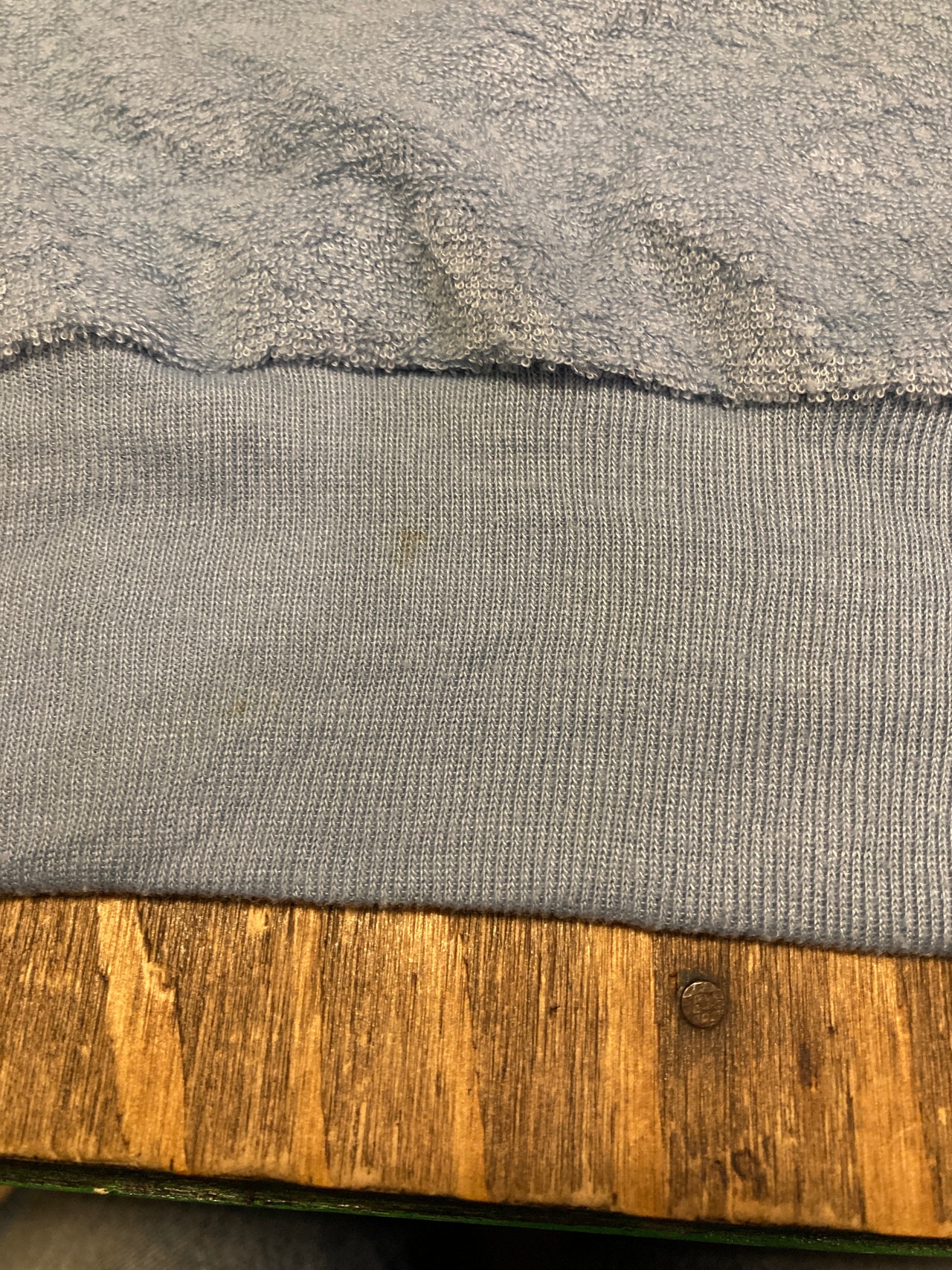 水色ベースのパイル素材に白のパイピンク、ボタンなしのスキッパータイプと個性的なデザインです。