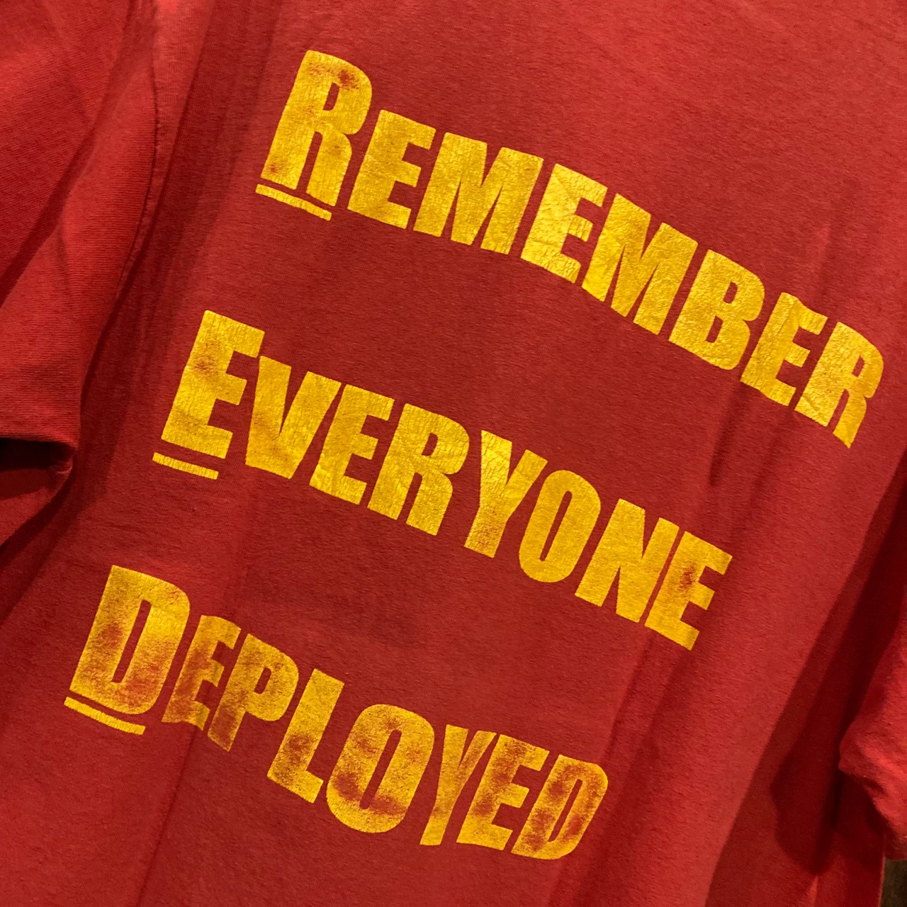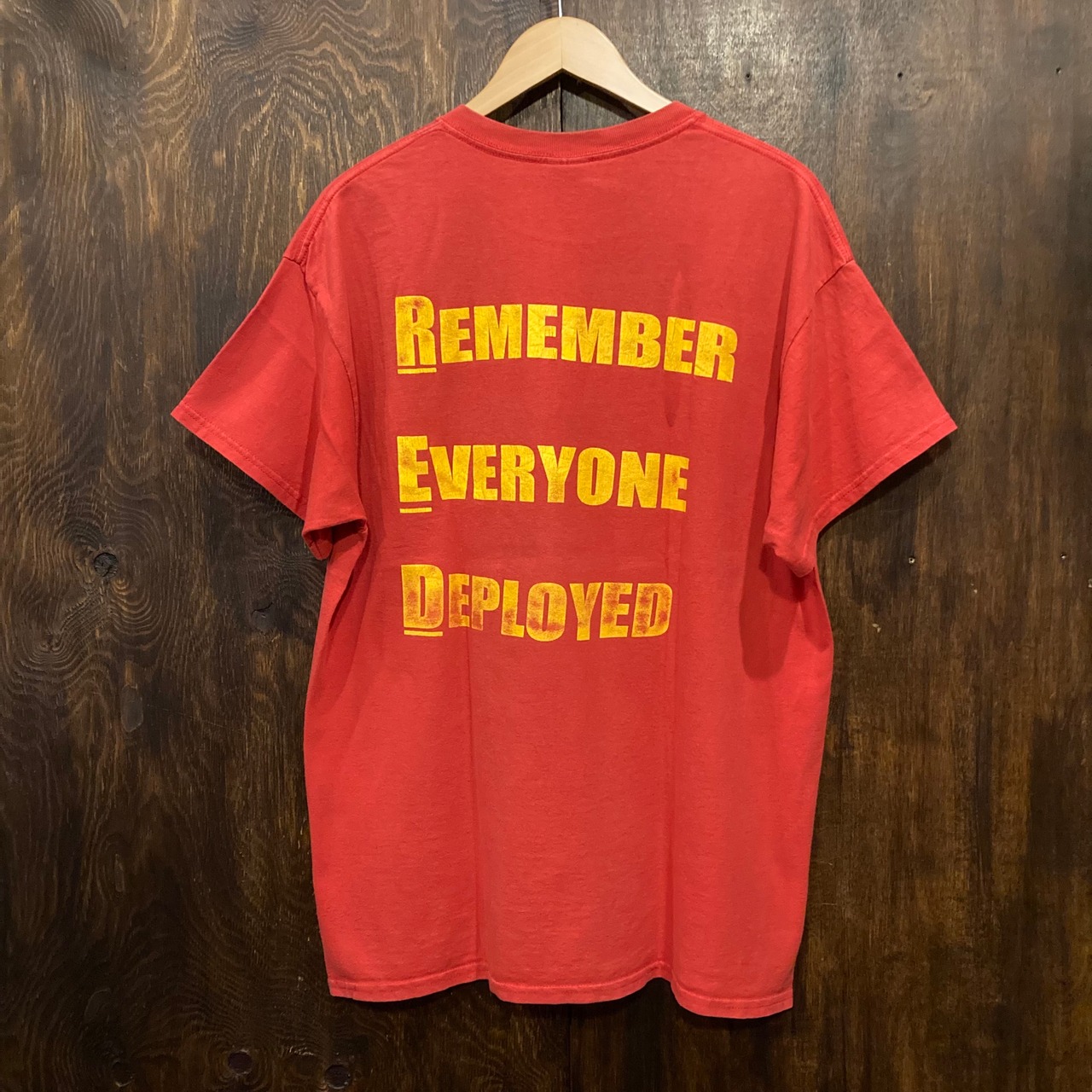 赤ボディにミリタリー風のフロントプリントと背面には3段ロゴプリント。