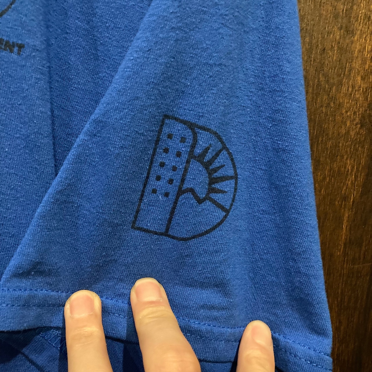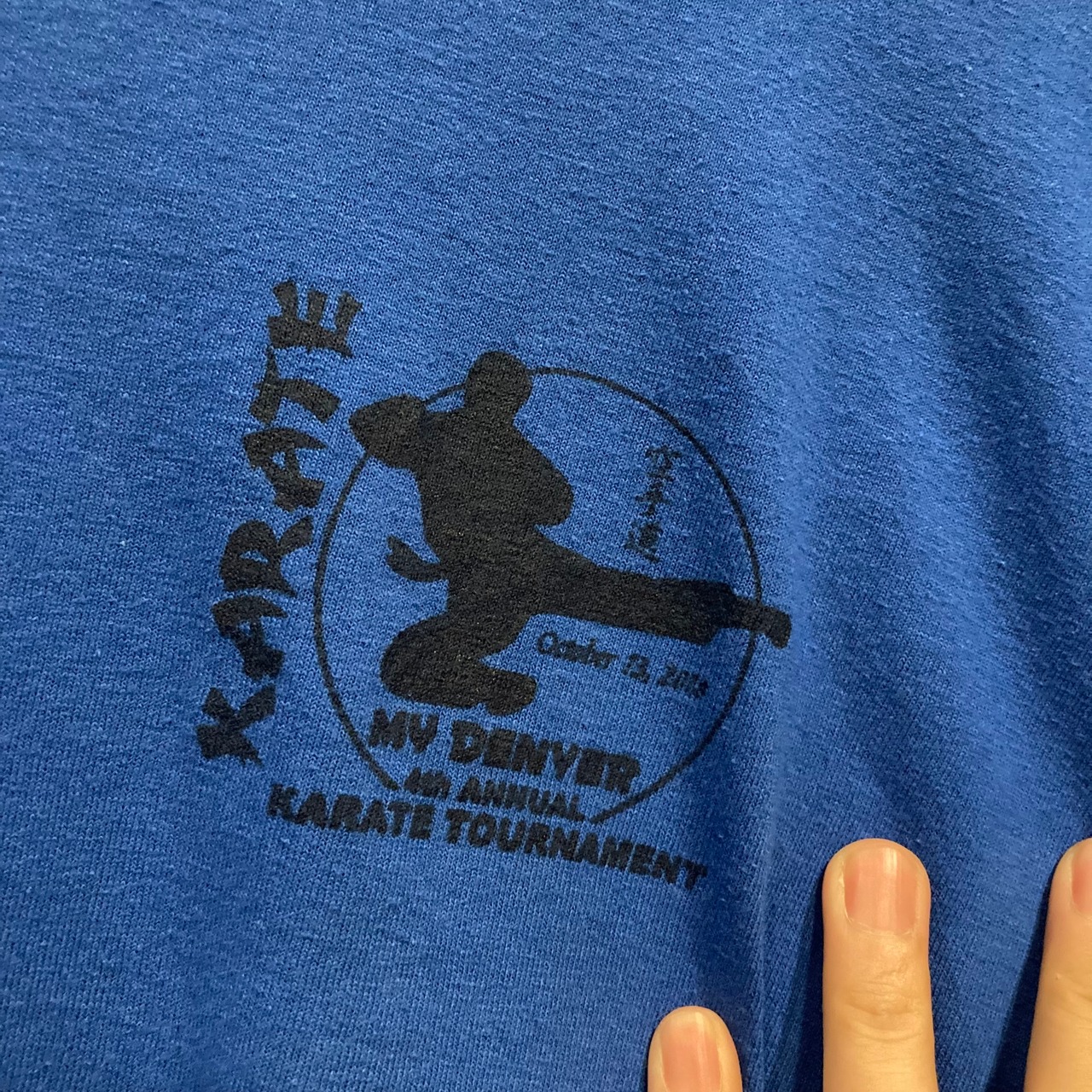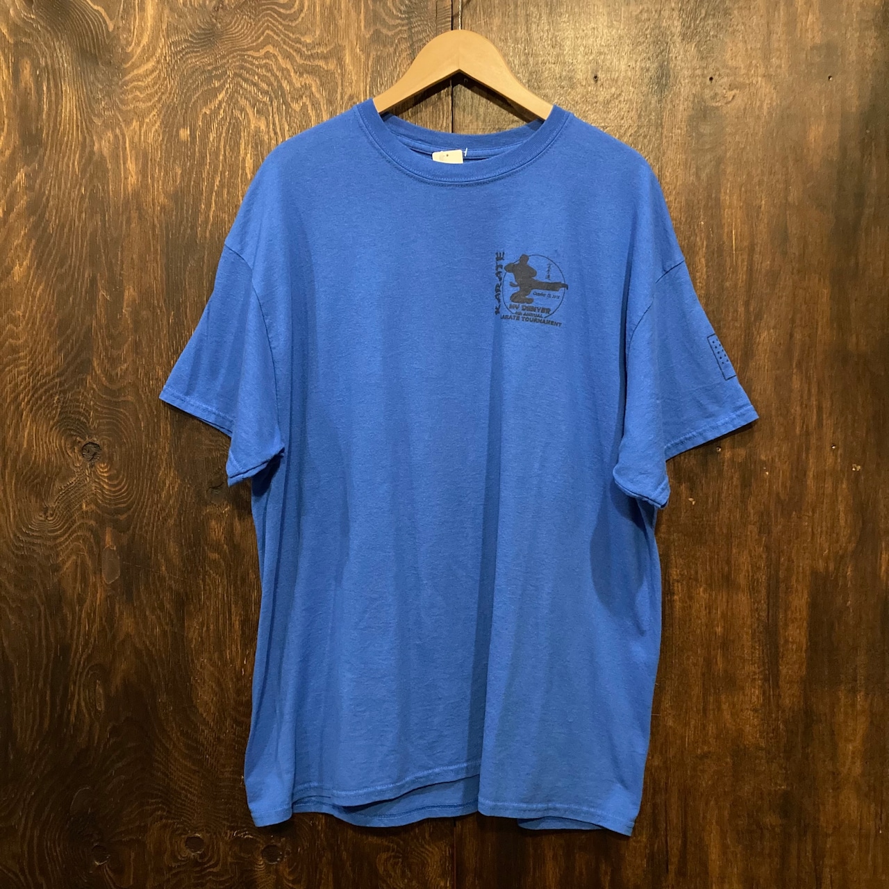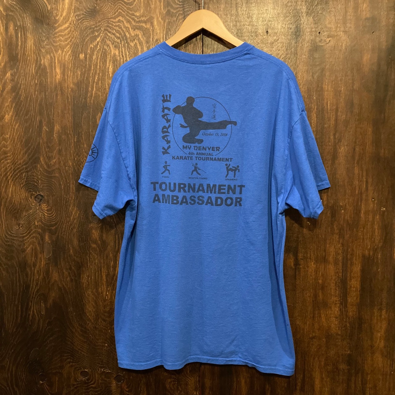 青ボディのフロント左胸と背面にアメリカの空手大会のロゴがプリントされた一品。
