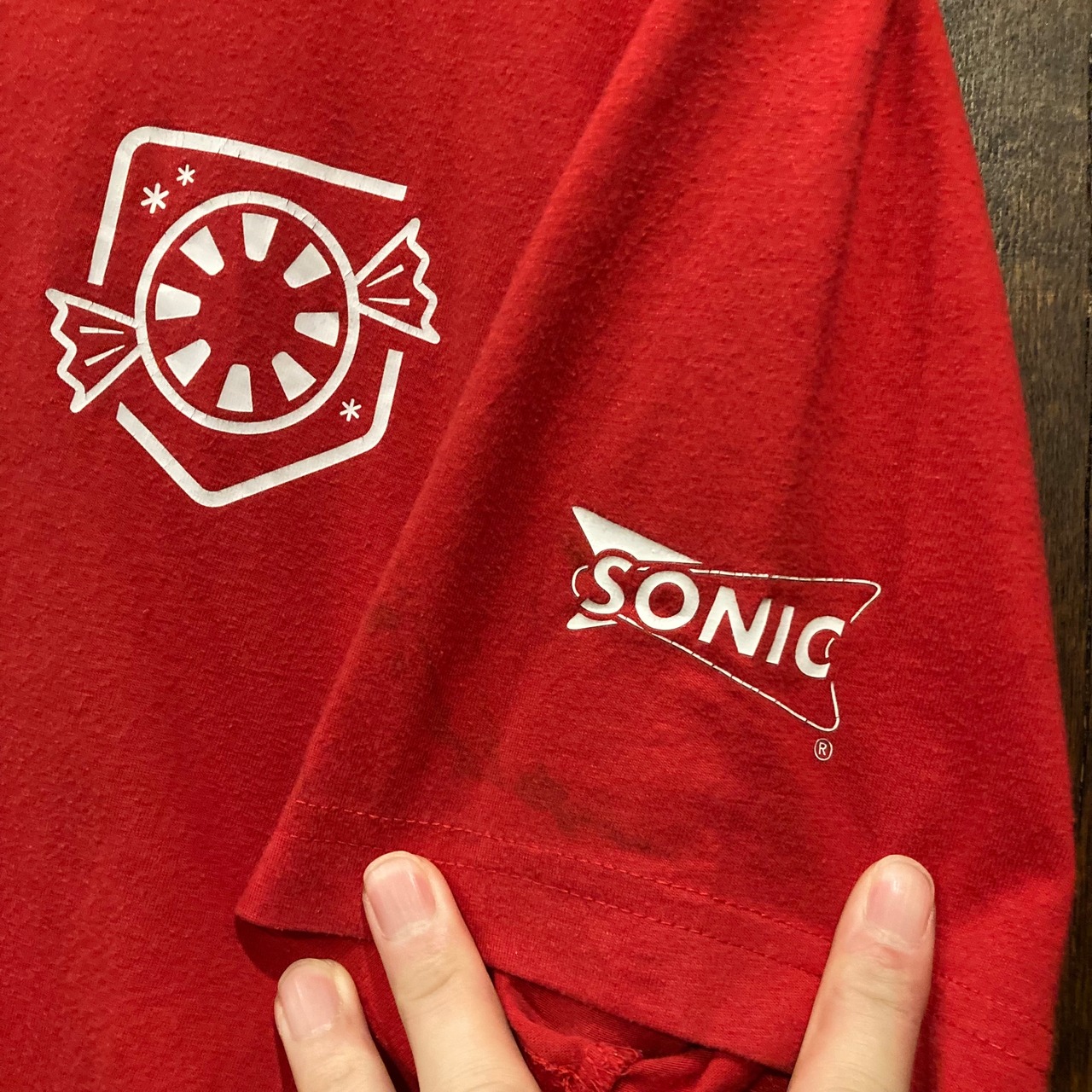 アメリカ古着 半袖 ヘンリーネックTシャツ SONIC ハンバーガー 赤 Sです。