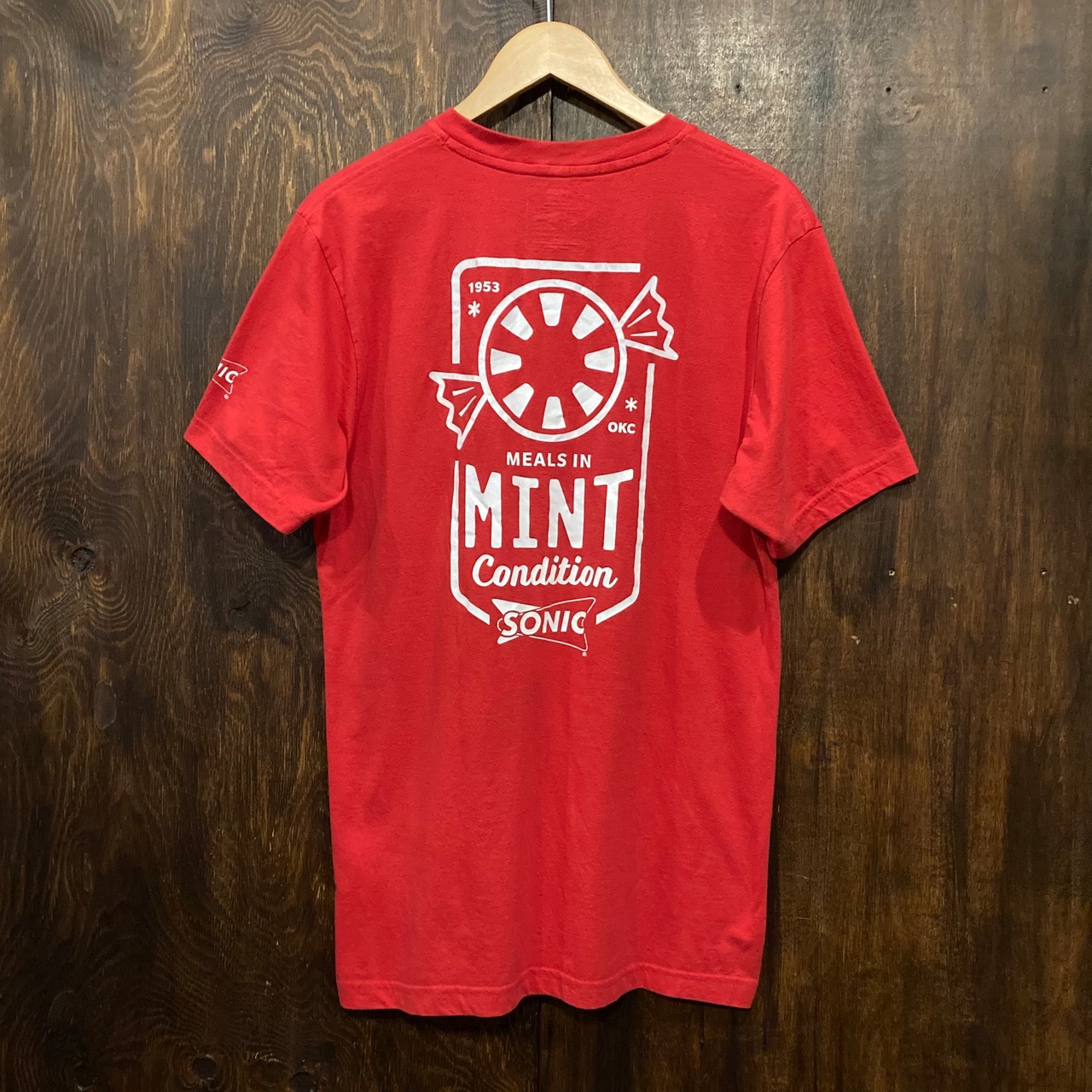 アメリカ古着 半袖 ヘンリーネックTシャツ SONIC ハンバーガー 赤 S 企業物