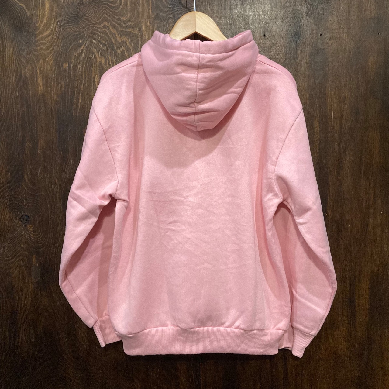 淡いピンクボディに同色のラメプリントが個性的なデザインのスウェットパーカー。