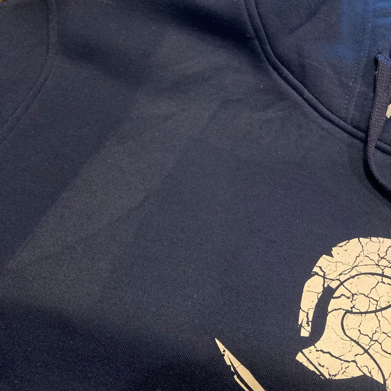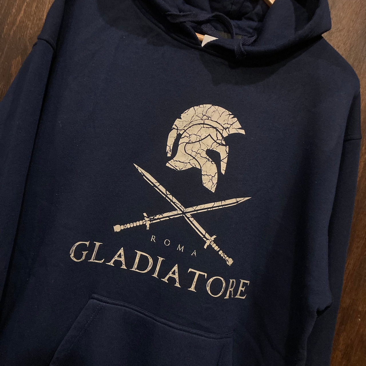 紺ボディにグラディエーターとプリントされたスウェットパーカー。