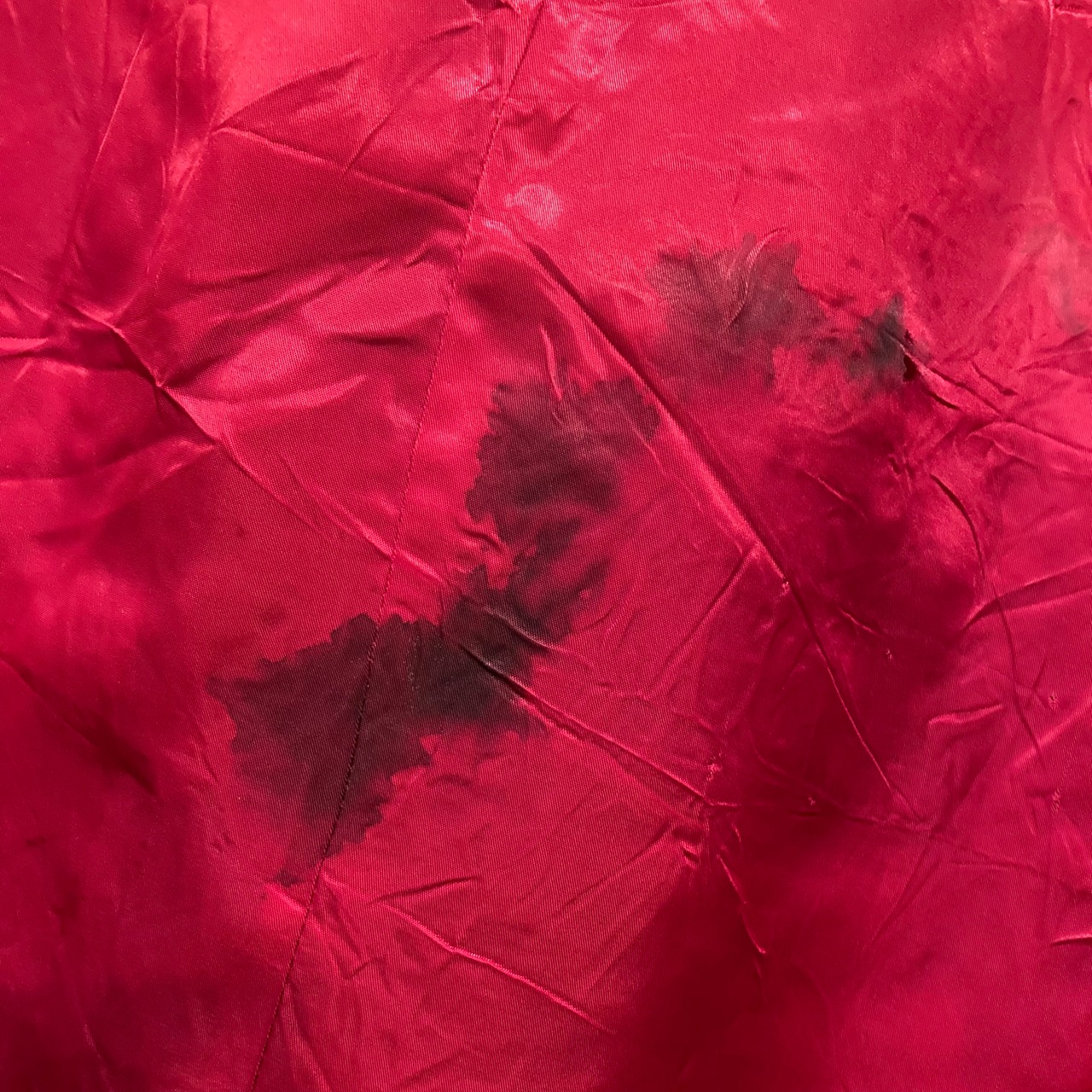 フロントは黒地のストライプ、バックは鮮やかな赤のサテン地が存在感のある一枚。