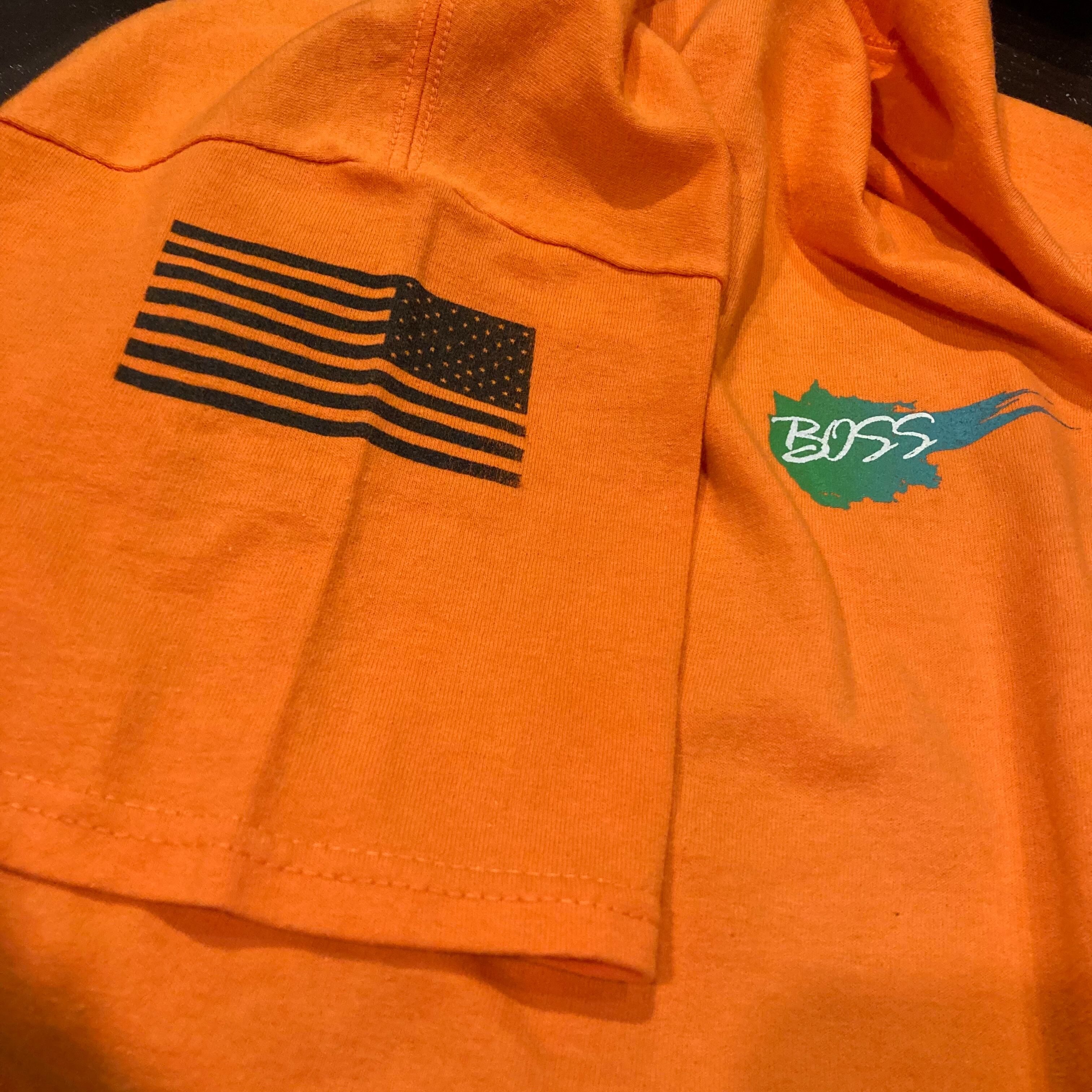 蛍光オレンジボディ、両袖、フロント、バッグ共にプリントが入った豪華なデザイン。