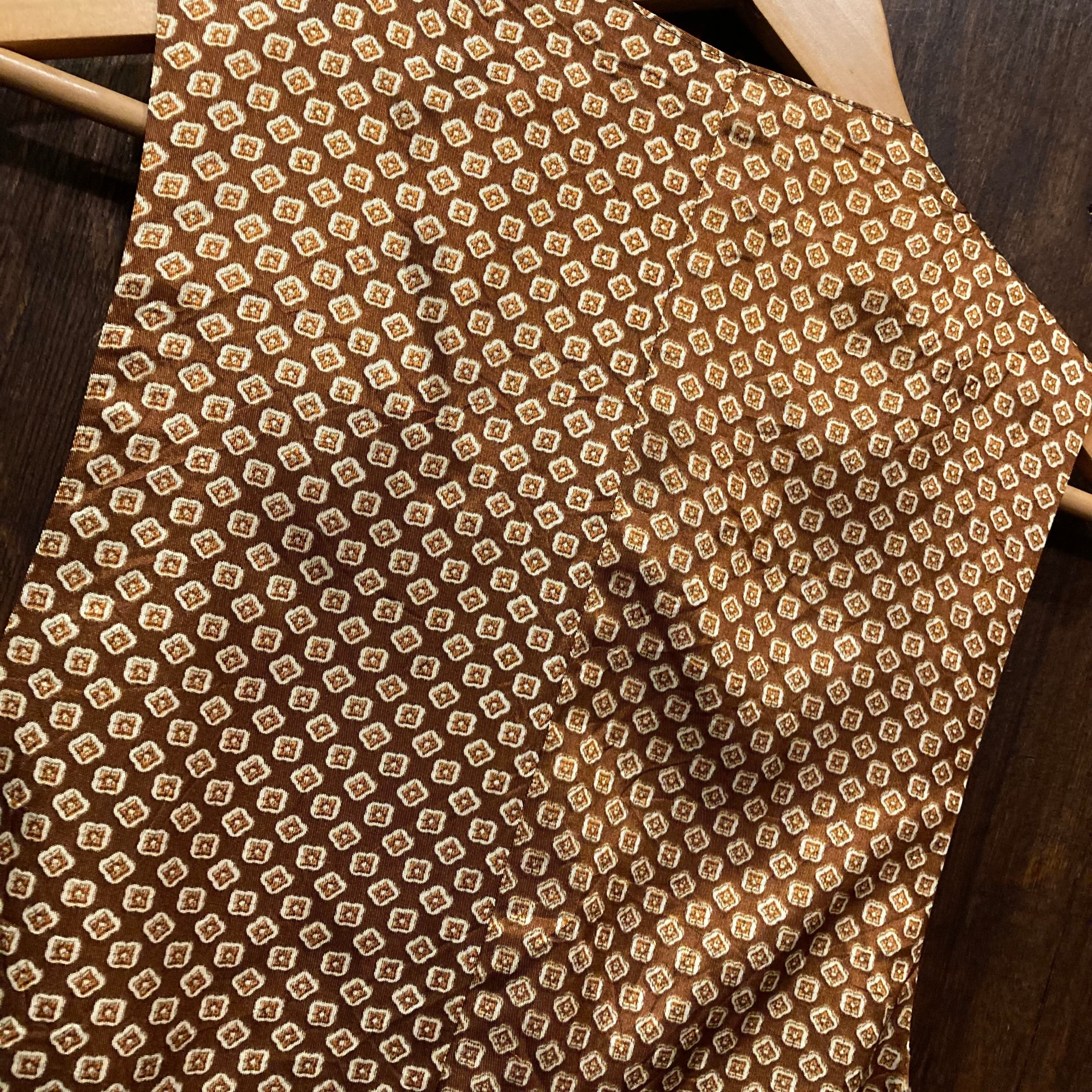 フロントはポリ素材の茶色単色、バックは茶系の総柄のサテン生地で個性的な一枚。