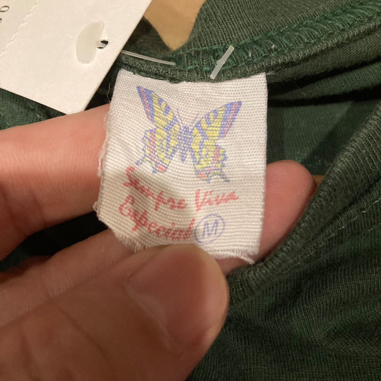 深緑ボディに肩や裾付近などマルチプリントが施された豪華なデザインのプリントTシャツ。