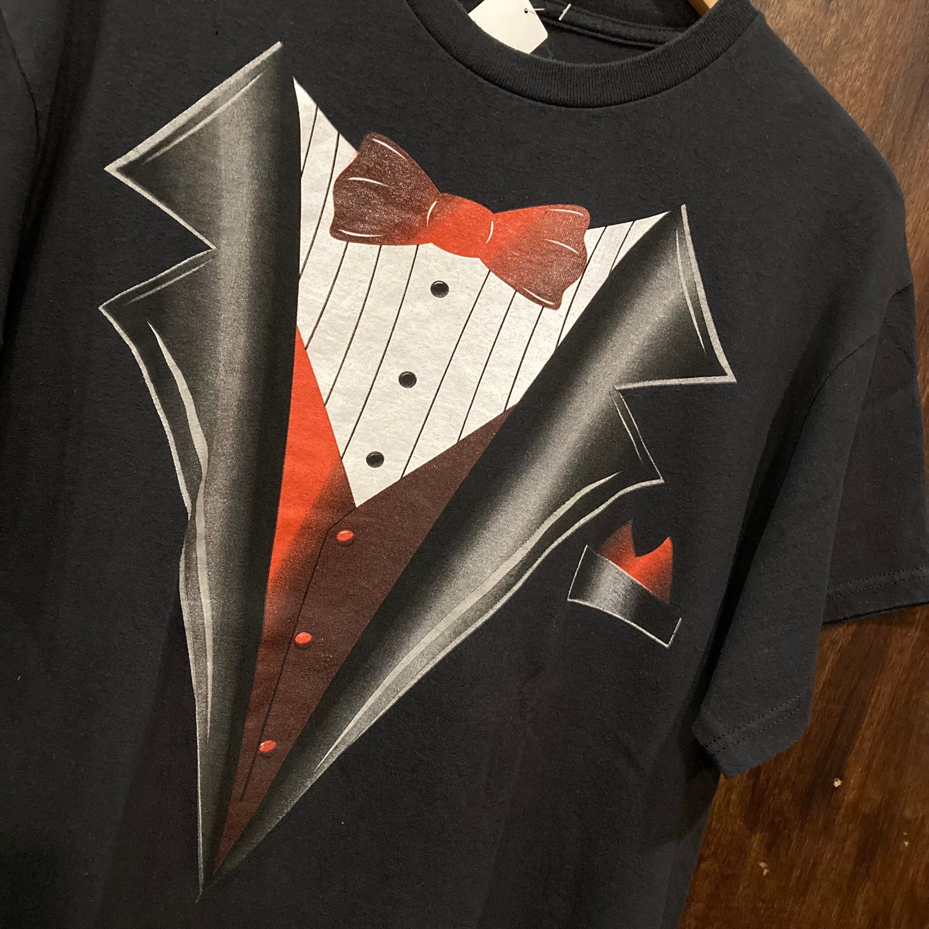黒ボディにタキシードがプリントされたユニークなプリントTシャツ。