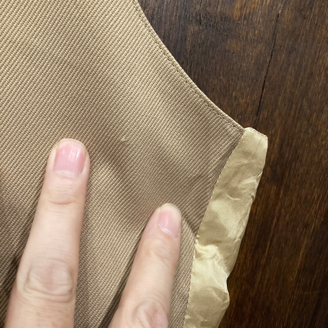 フロントはポリエステル系素材のベージュ単色、バックは同色系のサテン生地で渋めな一枚。