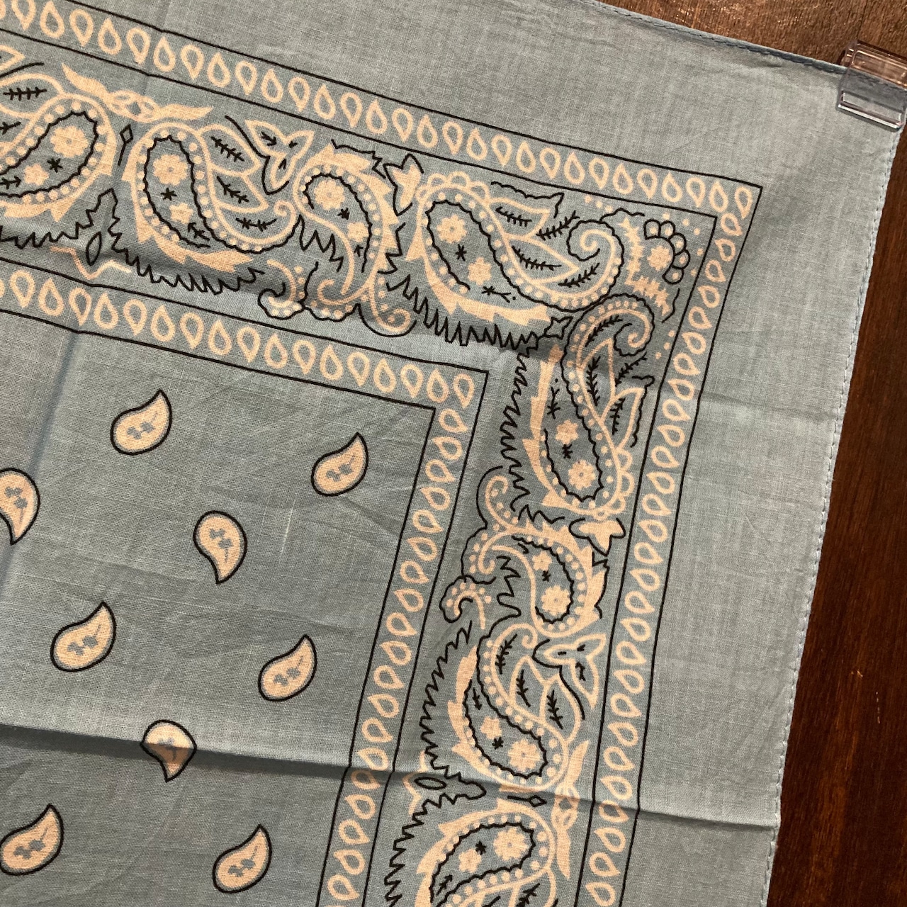 水色ボディに白×黒のペイズリー柄が爽やかで合わせやすいコットンバンダナ。