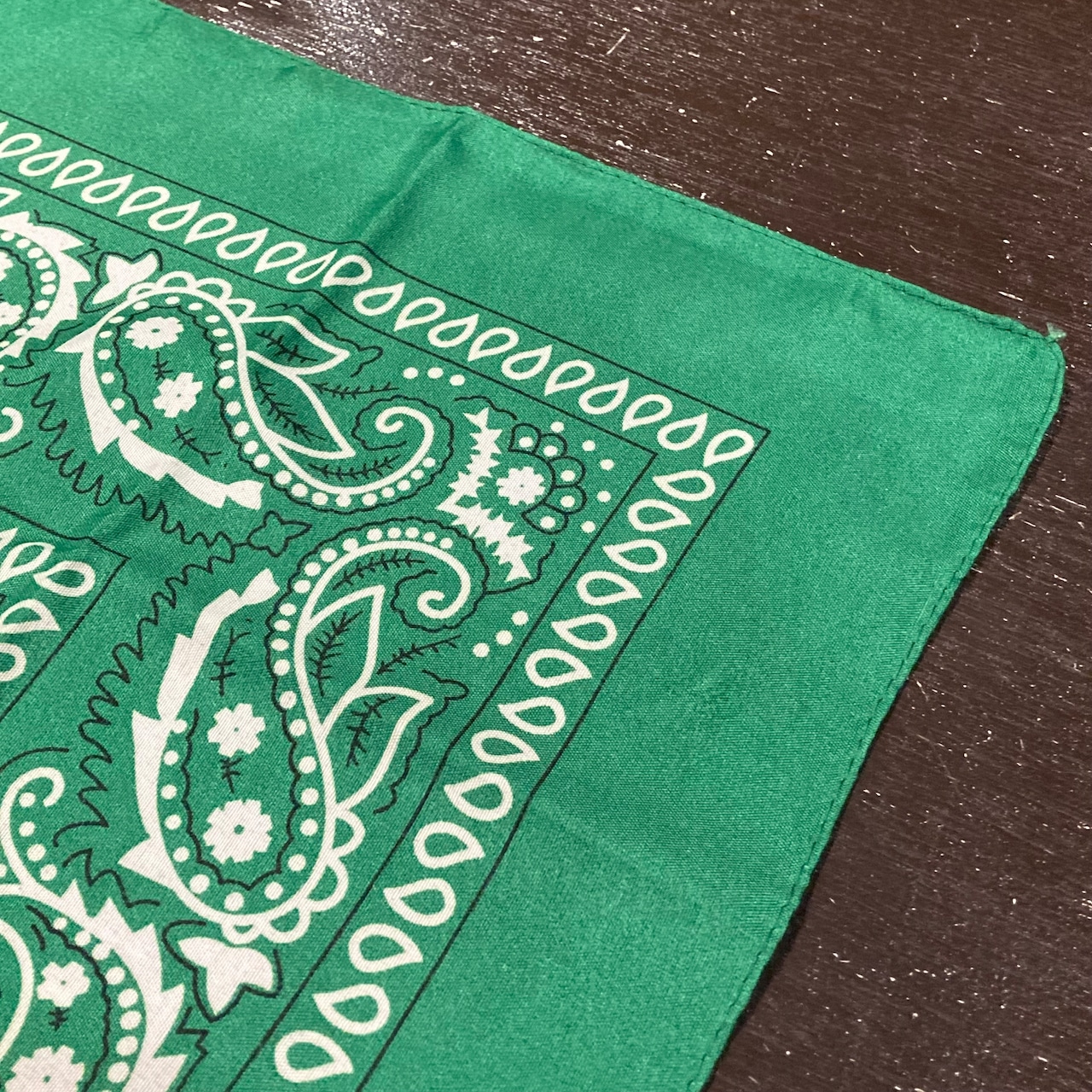 緑色ボディに白×黒のペイズリー柄が爽やかで合わせやすいコットンバンダナ。