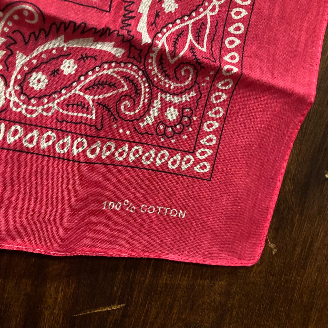 鮮やかなピンクボディに白×黒のペイズリー柄が個性的なコットンバンダナ。