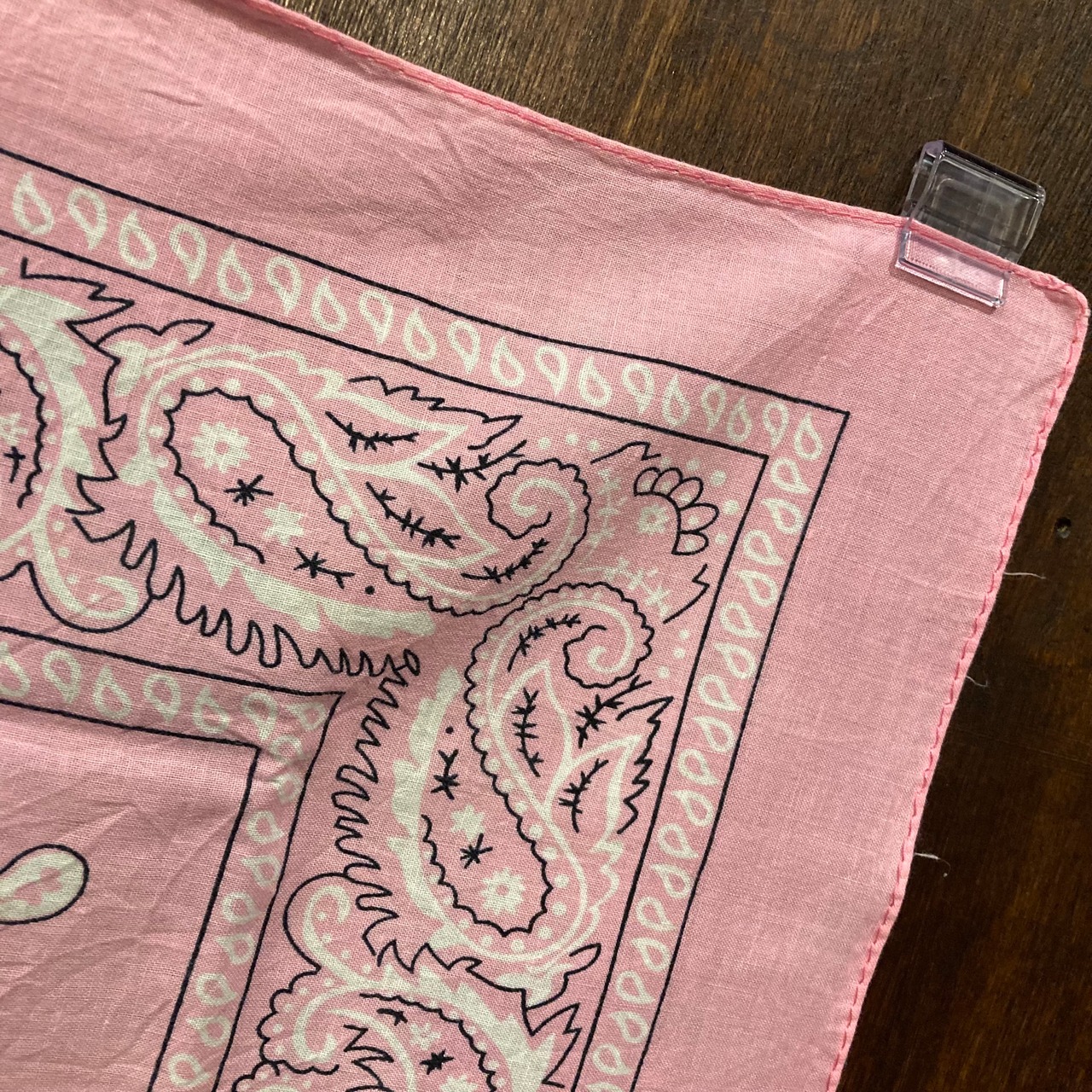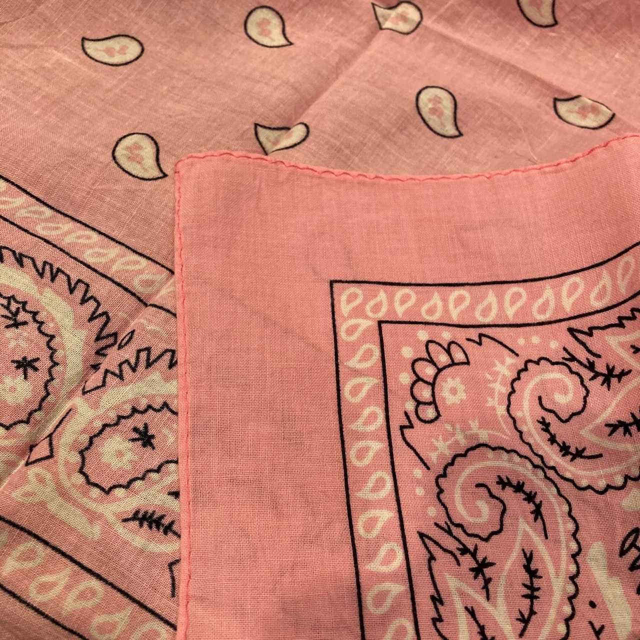 淡めのピンクボディに白×黒のペイズリー柄が爽やかで合わせやすいコットンバンダナ。