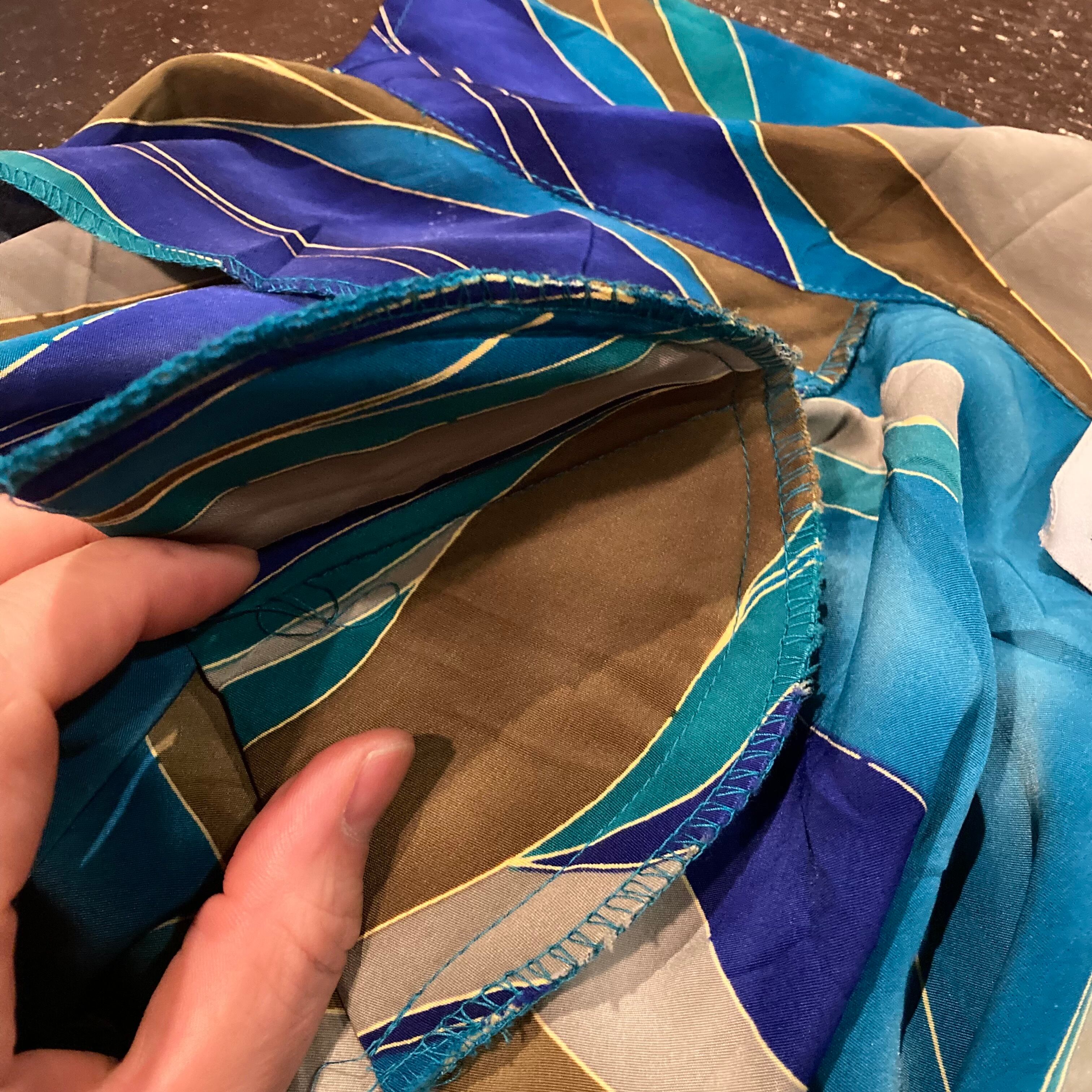 ターコイズブルーやエメラルドブルー地に独特の柄が前面に施された個性的な一枚。