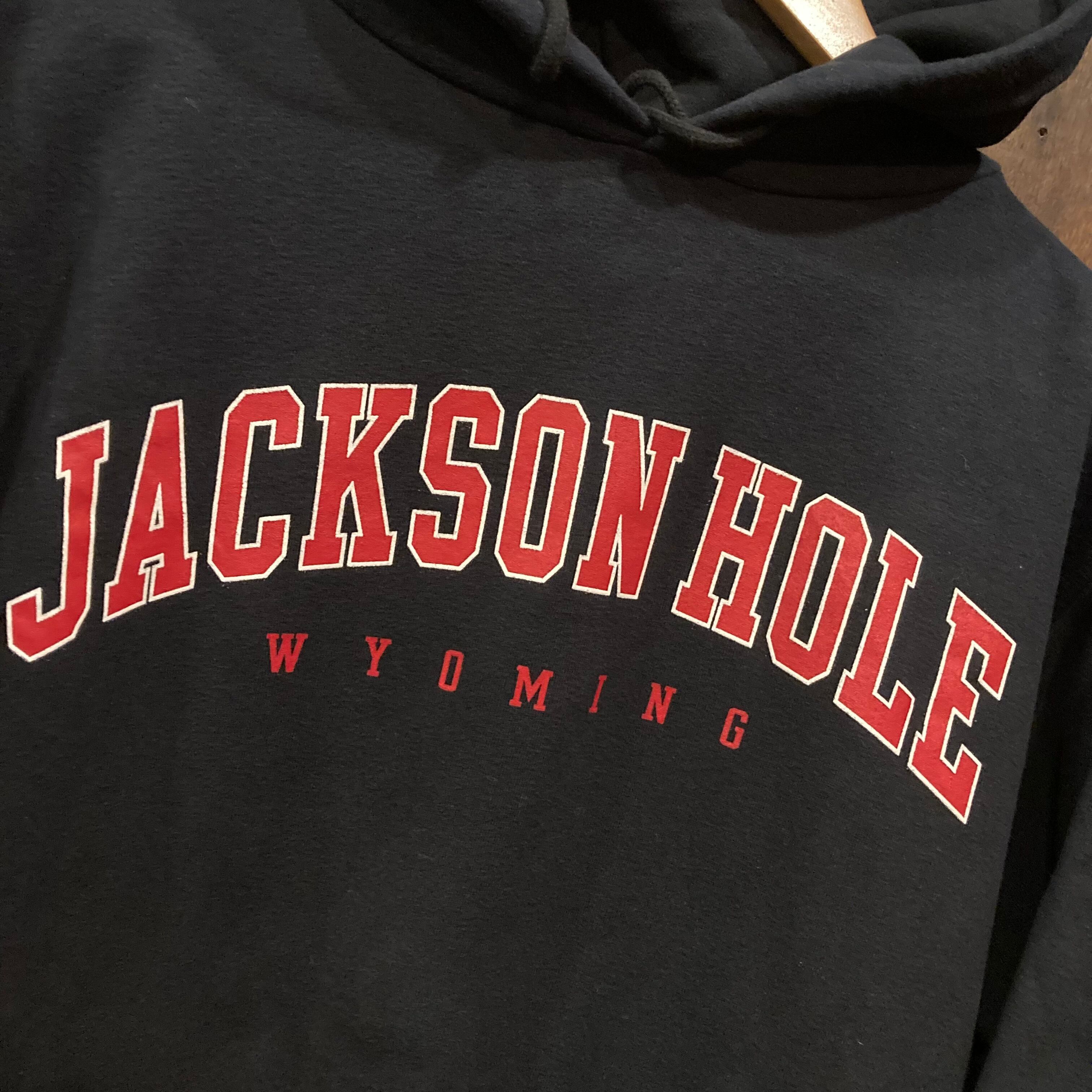 黒ボディにワイオミング州北西部の地域ジャクソンホールとプリントされた、良い雰囲気のスウェットパーカー。