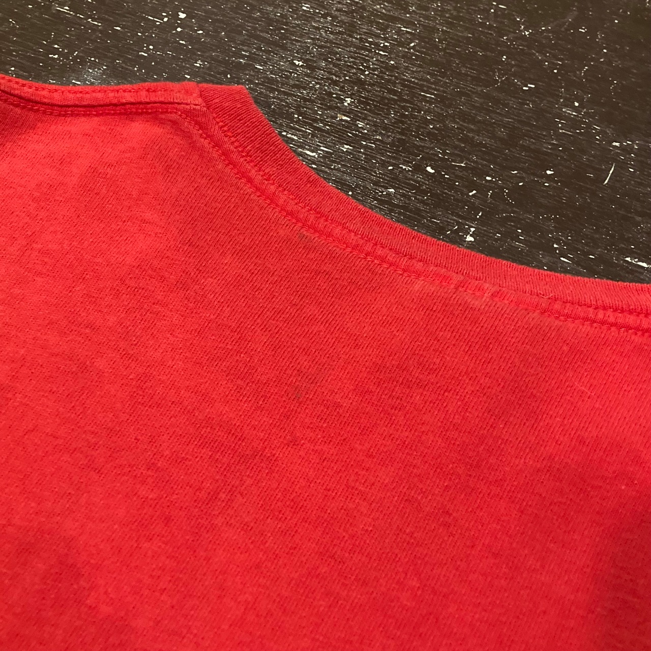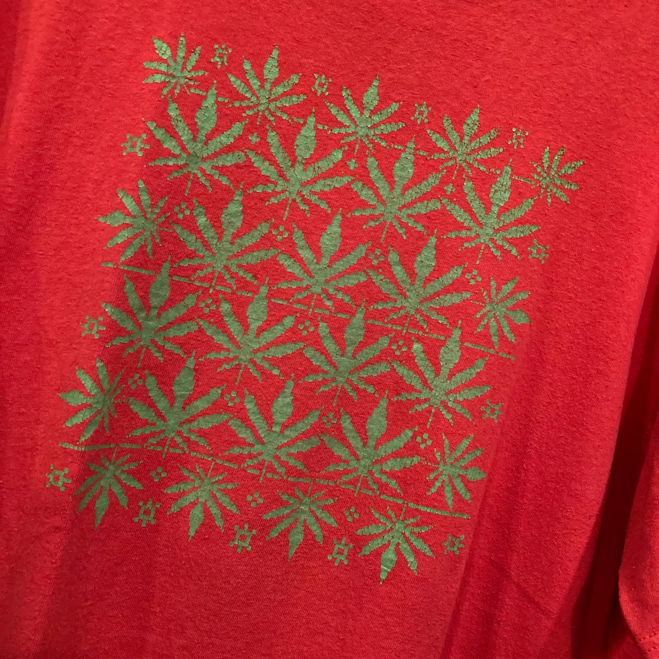 赤ボディにクリスマスモチーフプリントが施されてますが、よく見ると柄がカンナビスになったユニークな一枚。